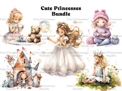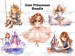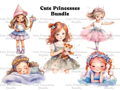 Indulge in the sweetness of royalty with our Cute Princesses clip art. These adorable digital illustrations feature princesses in charming dresses, sparkling tiaras, and with friendly animal companions, perfect for adding a touch of fairy tale magic and innocence to your designs, whether for children's books or themed events.