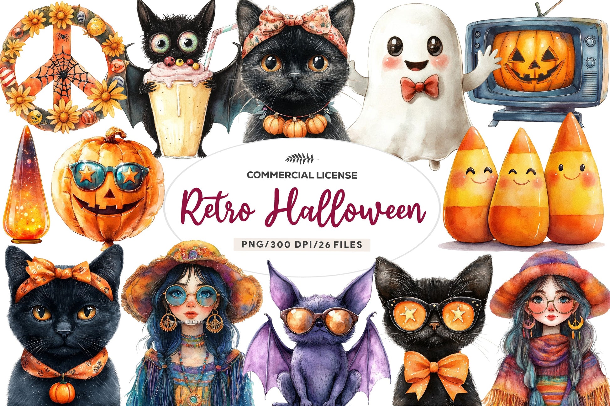 Spook with this Cute Retro Halloween Clipart Bundle, featuring vintage spooky designs, perfect for kawaii Halloween crafts.