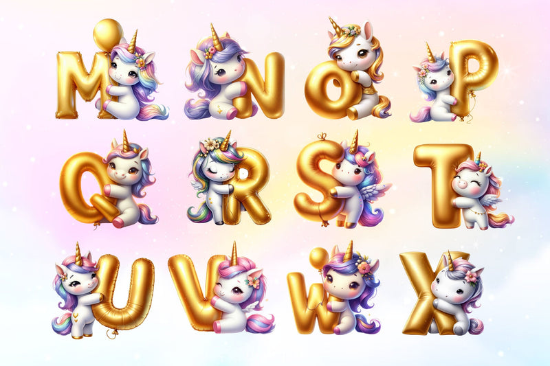 Spell with this Cute Unicorn Gold Alphabet Clipart Bundle, featuring magical letter designs, perfect for fantasy education crafts.