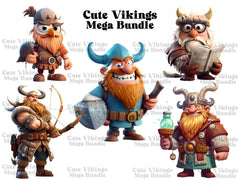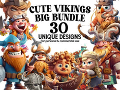 Embark on a whimsical adventure with our Cute Vikings digital clip arts, presenting Viking characters in a playful and adorable light. With their miniature helmets, axes, and shields, these designs add a fun and spirited vibe to any project, capturing the essence of Norse mythology with a friendly twist.