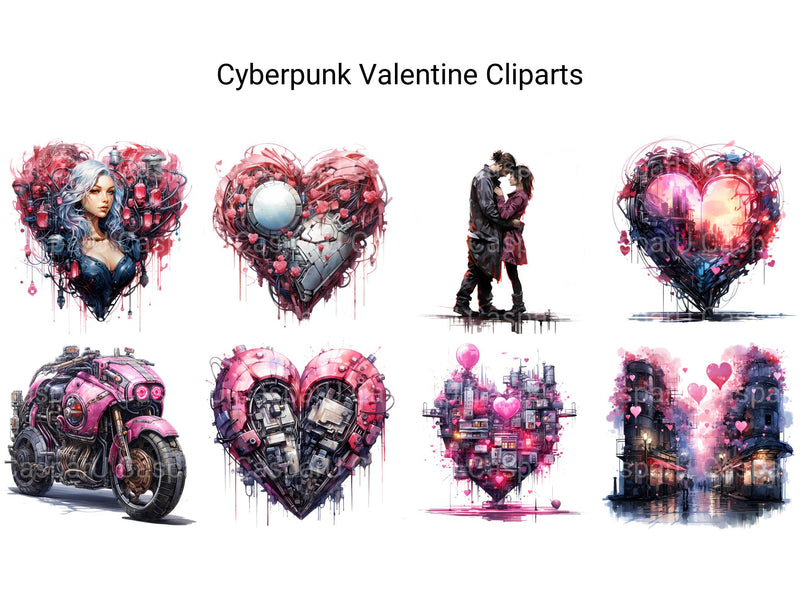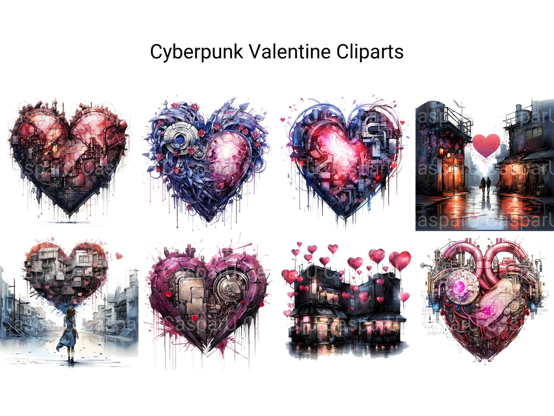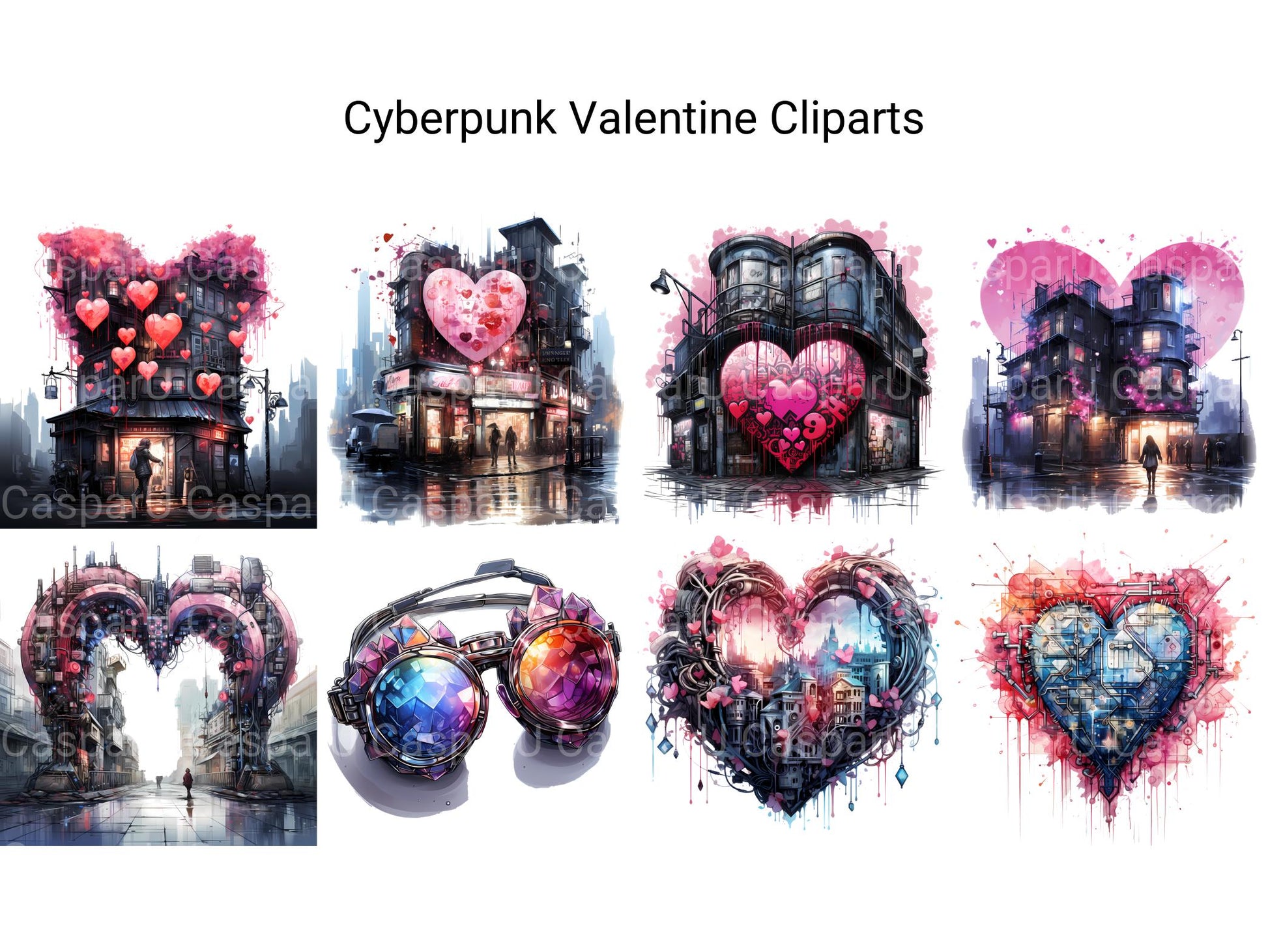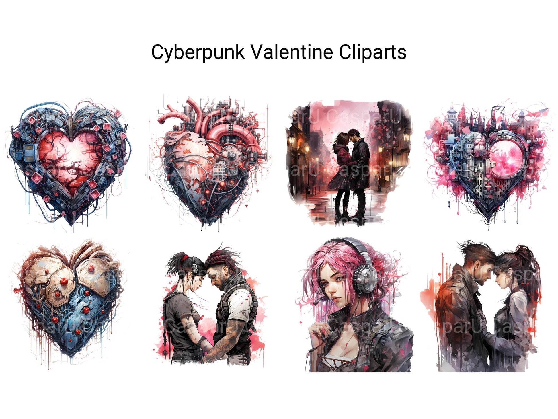 Transport your Valentine's Day celebrations to a futuristic realm with digital clip art featuring cyberpunk-inspired illustrations. From neon cityscapes to cybernetic hearts, these edgy and stylish images offer a modern twist on romance, perfect for adding a unique and contemporary flair to your projects, whether for cards, posters, or digital art, inviting viewers to explore love in the digital age with a cyberpunk twist.