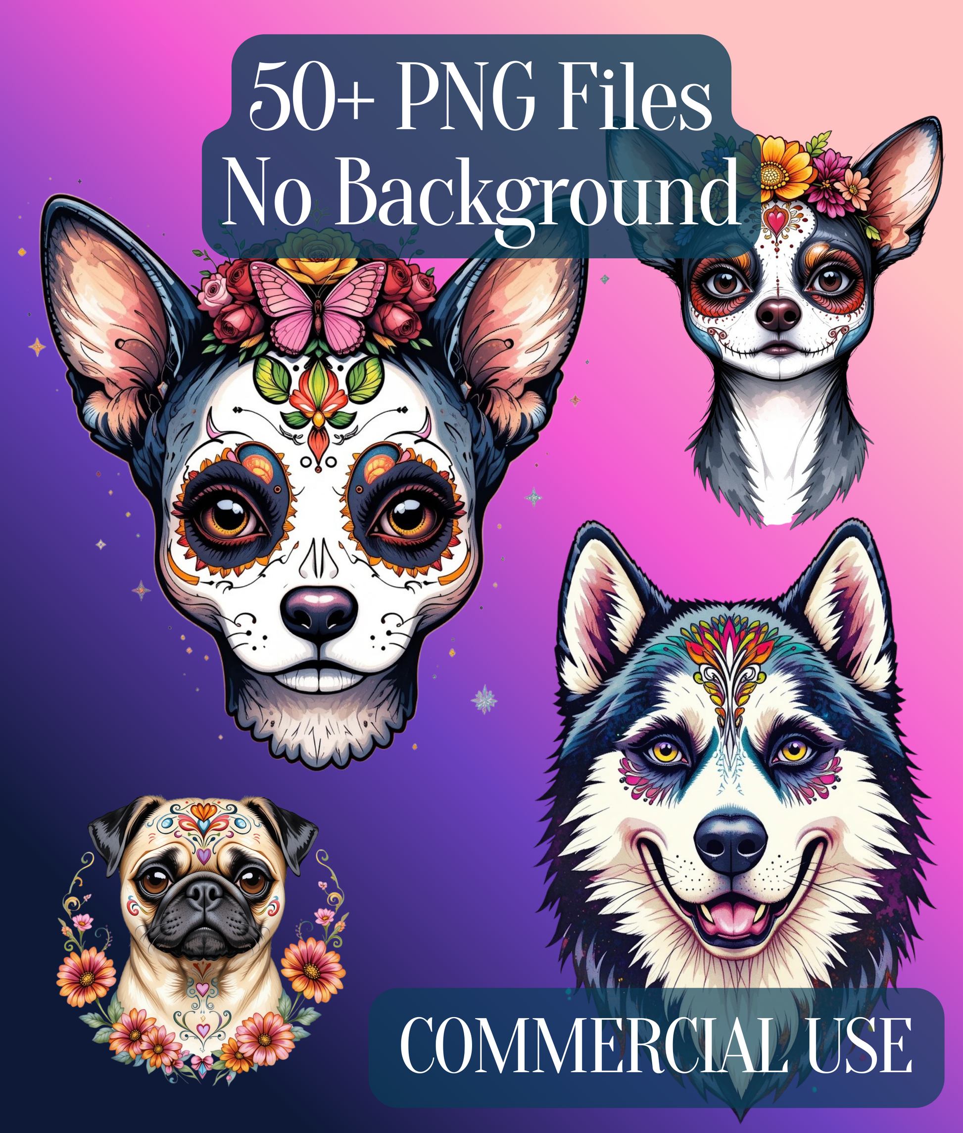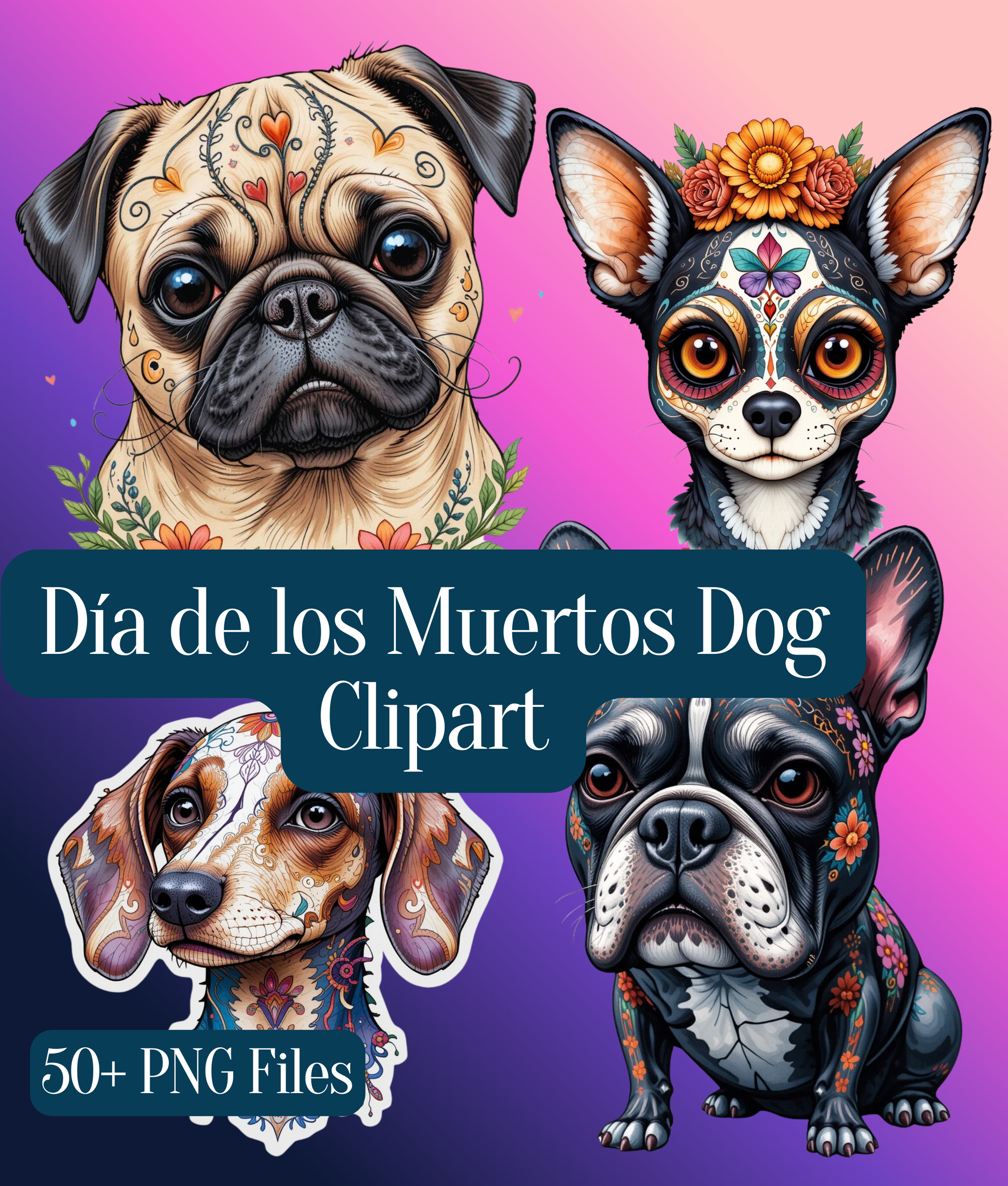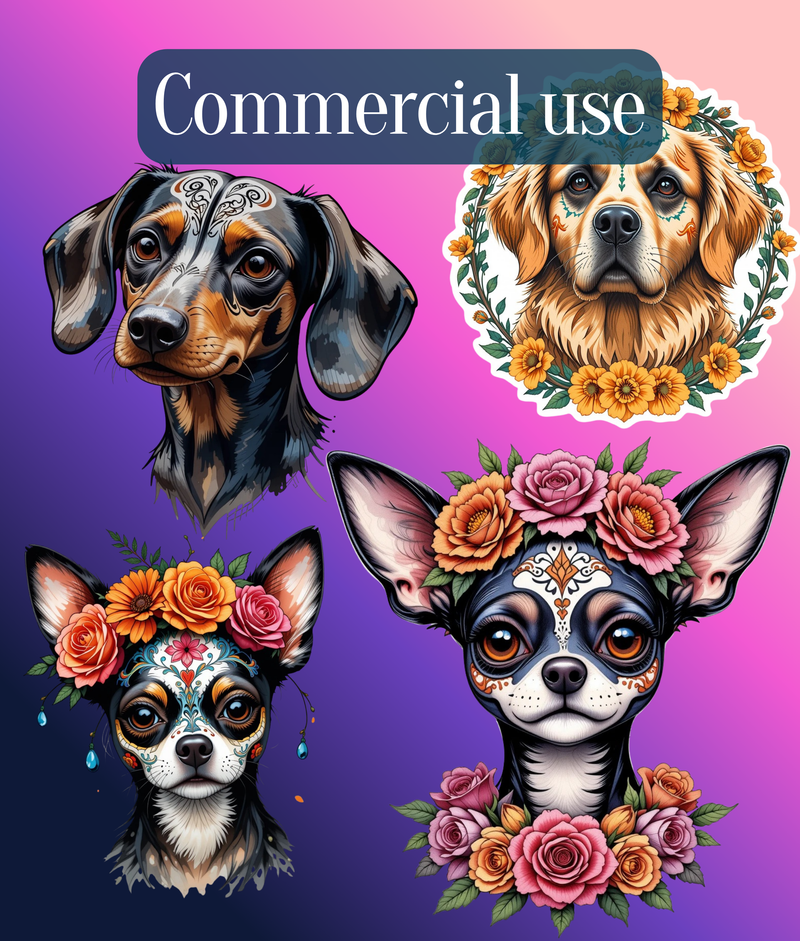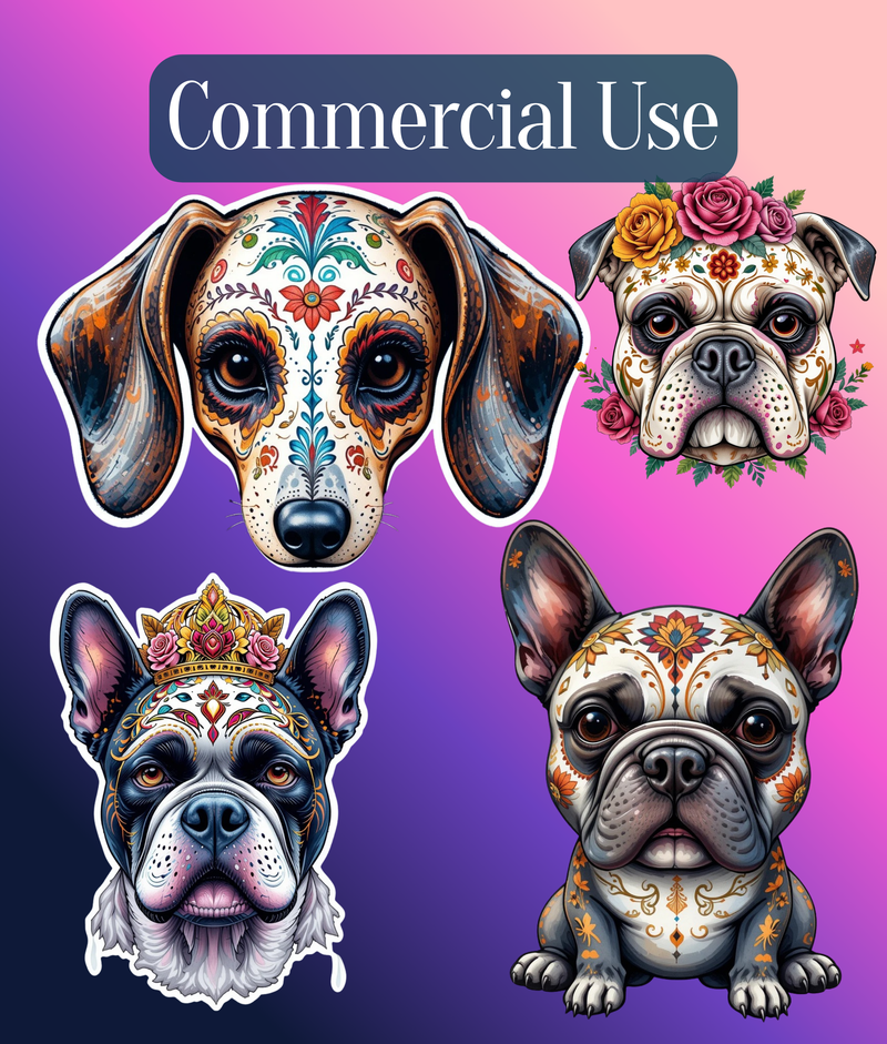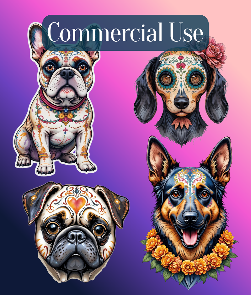 Celebrate the vibrant spirit of Dia de los Muertos with our Dogs Clipart Bundle. Perfect for festive crafts, digital projects, and unique designs, this collection features charming dog illustrations adorned with traditional Day of the Dead motifs. Ideal for scrapbooking, invitations, and more, these high-quality graphics bring a touch of cultural flair to any creative endeavor. Unleash your creativity and honor this rich tradition with our exclusive clipart set.