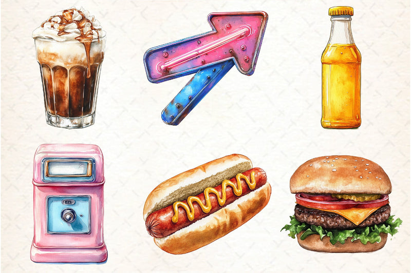 Unleash your creativity with our Diner Clipart Bundle, packed with nostalgic diner graphics to elevate your artistic projects and bring a touch of retro flair.