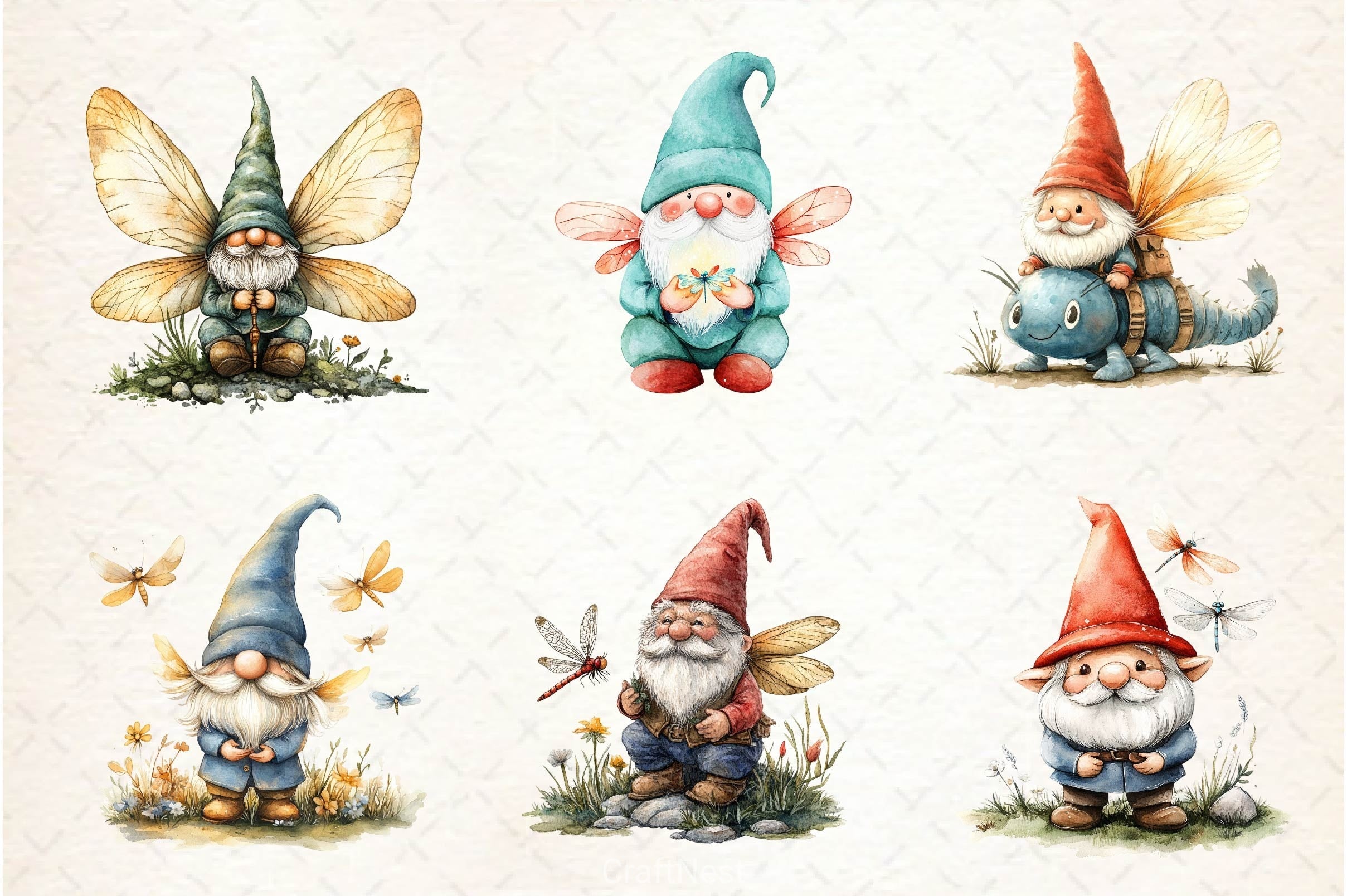 Whimsical gnomes with dragonflies for magical nature projects.