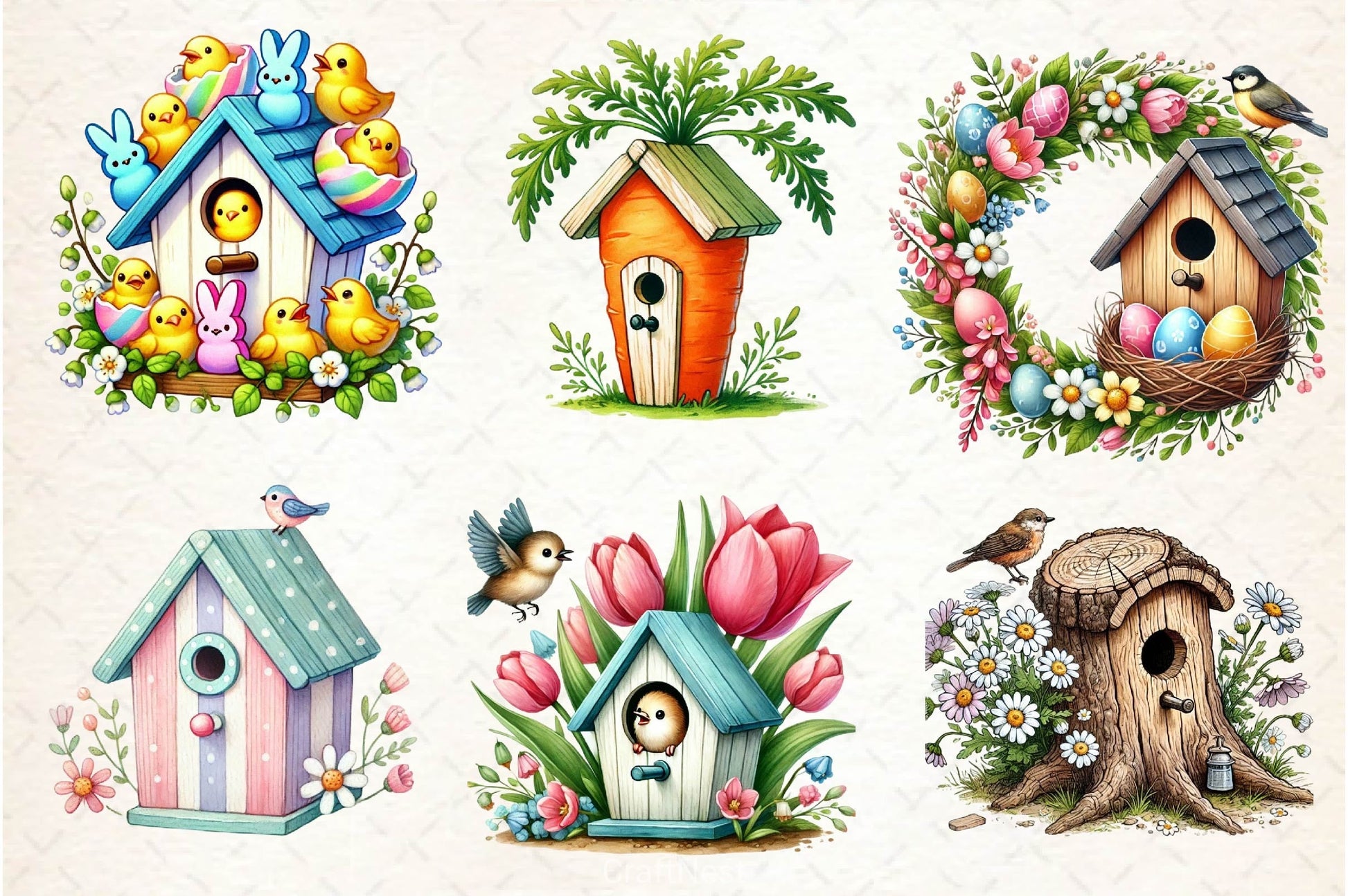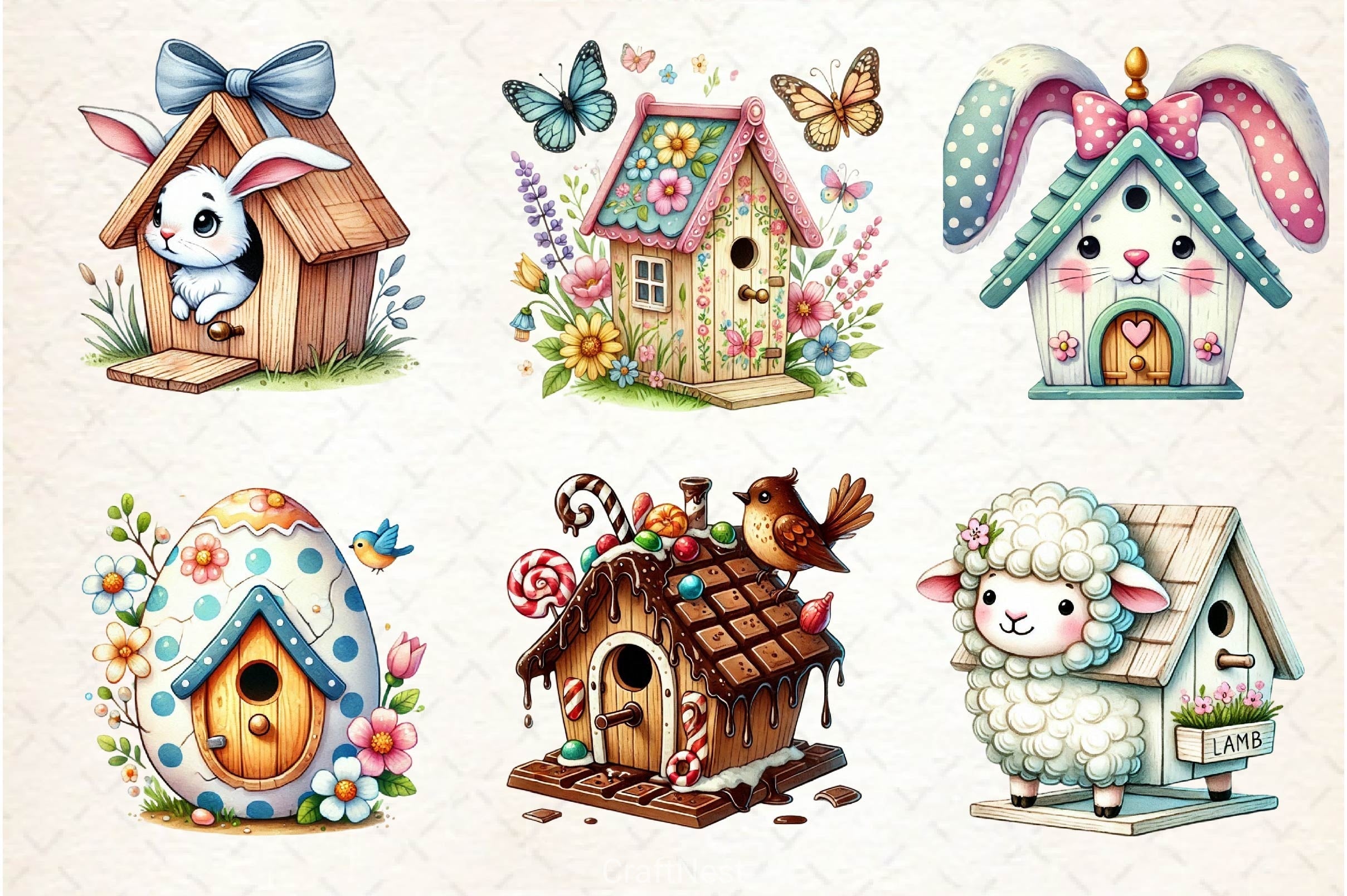 Nest with this Easter Bird House Clipart Bundle, featuring spring bird home designs, perfect for Easter garden crafts.