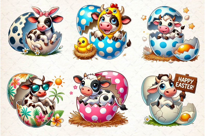 Hatch with this Easter Cow On Cracked Egg Clipart Bundle, featuring farm animal spring designs, perfect for Easter farm crafts.