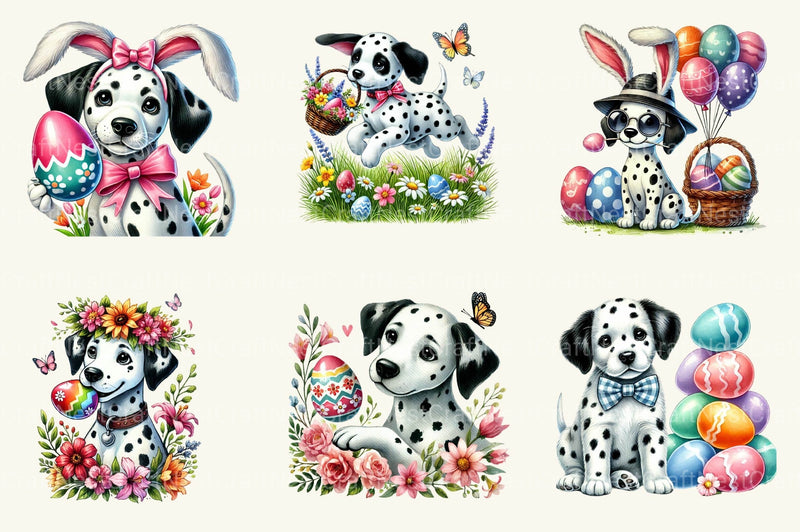 Spot with this Easter Dalmatian Dog Clipart Bundle, featuring spotted Easter designs, ideal for dog lover holiday crafts.