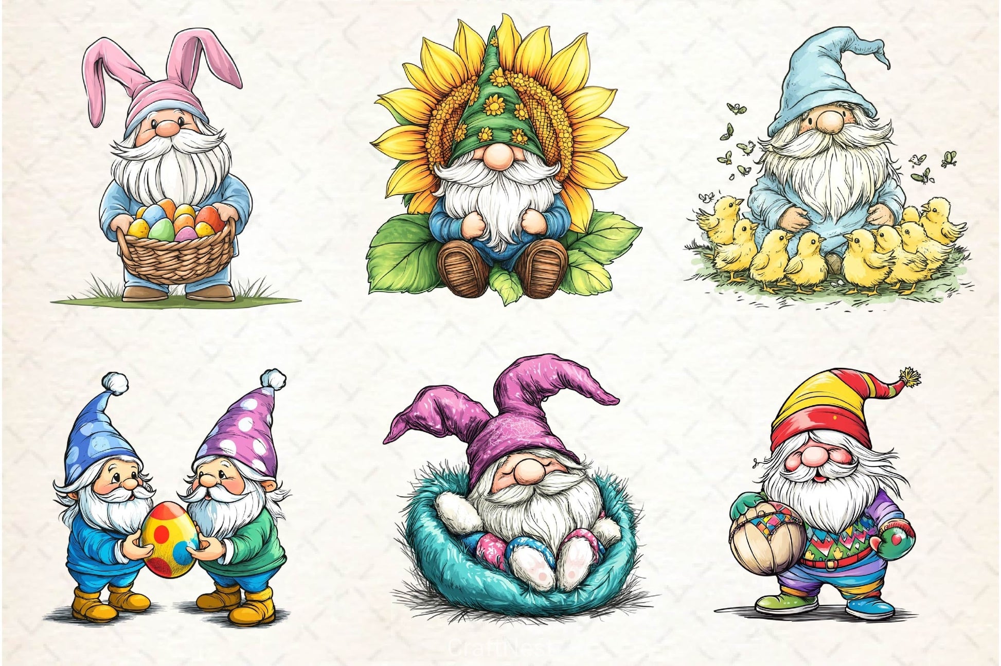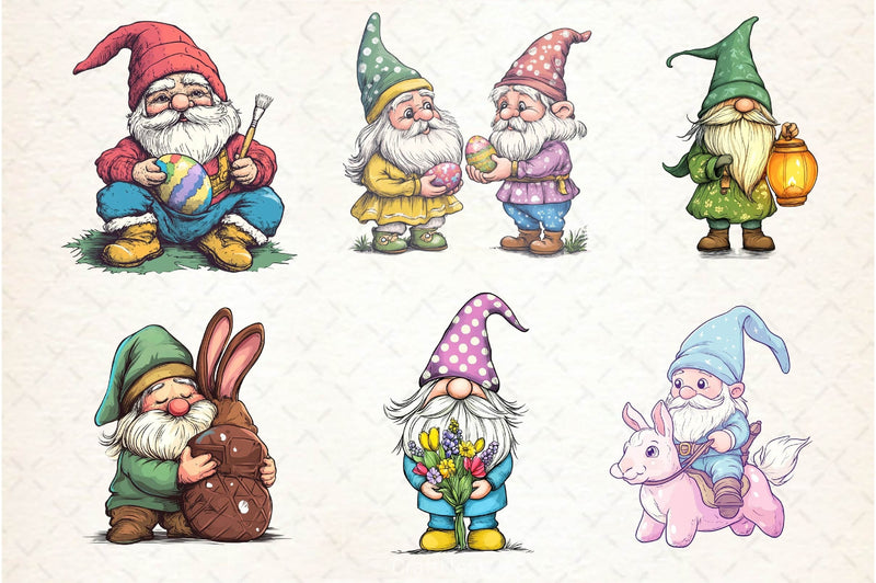 Whimsical gnomes celebrating Easter for magical spring projects.
