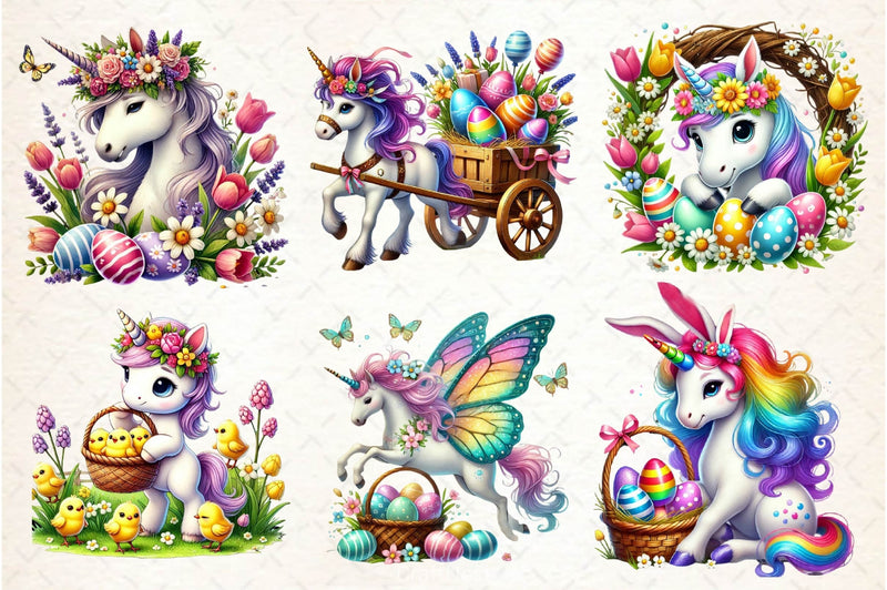 Magical unicorns celebrating Easter for fantasy spring projects.