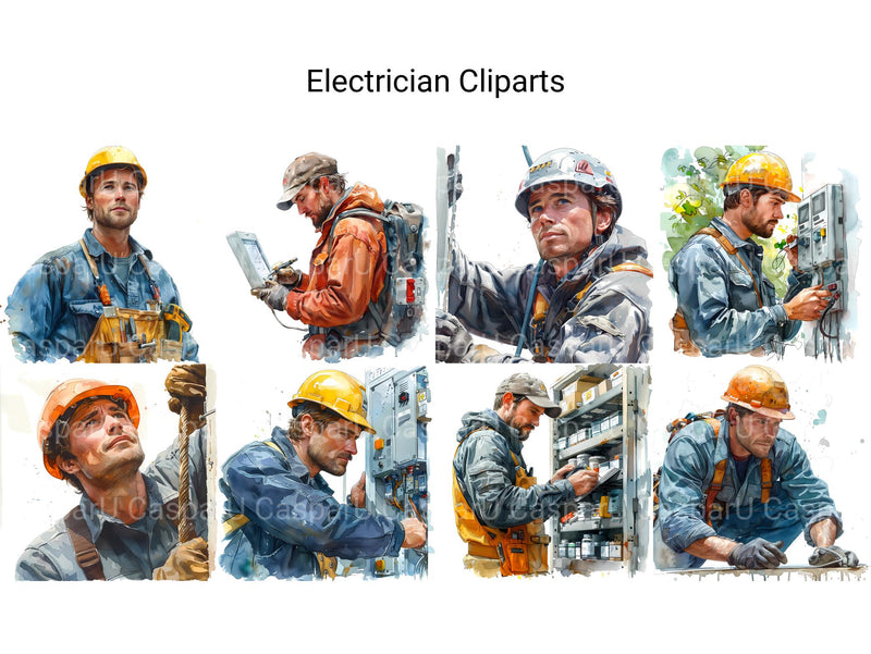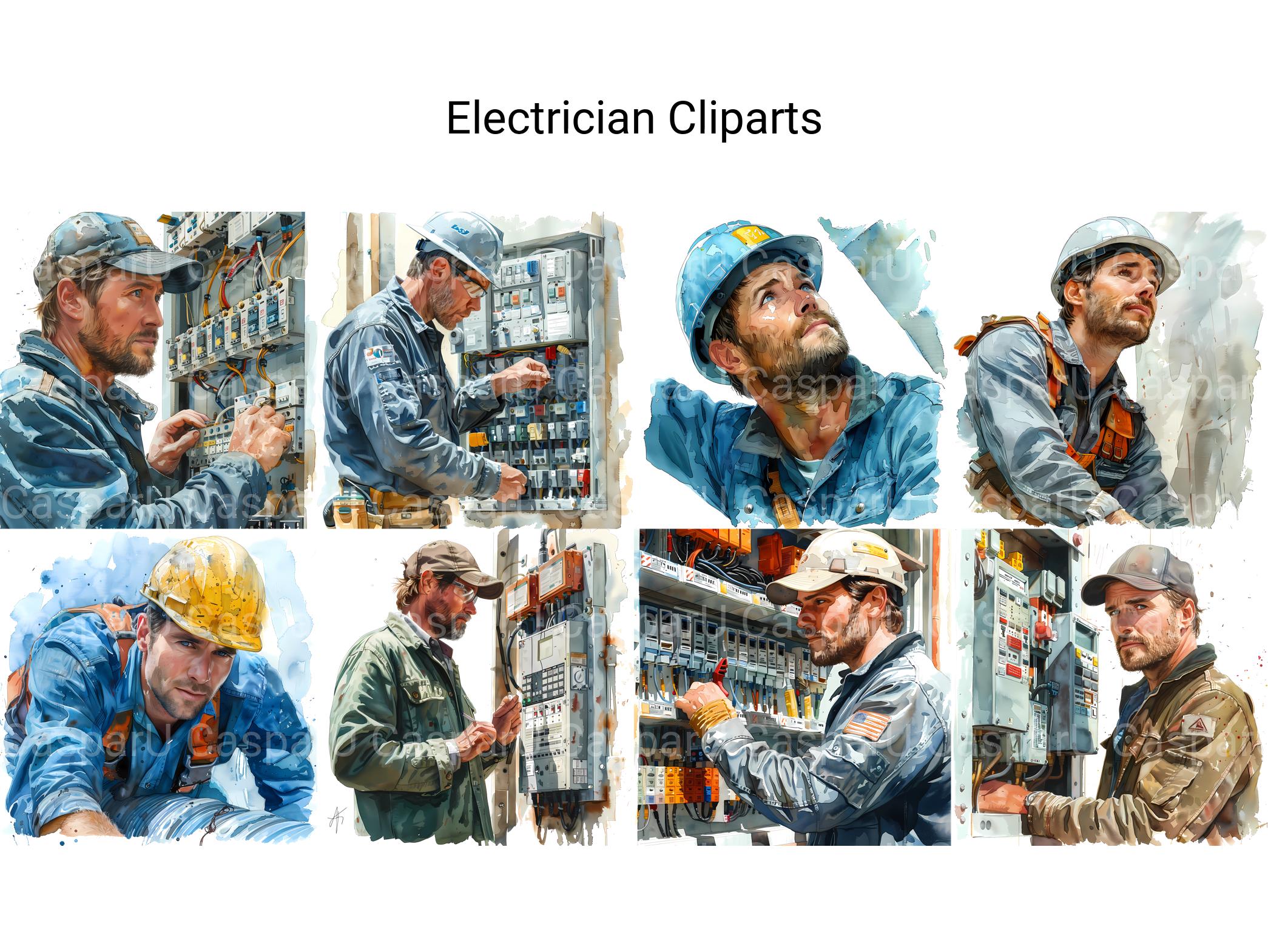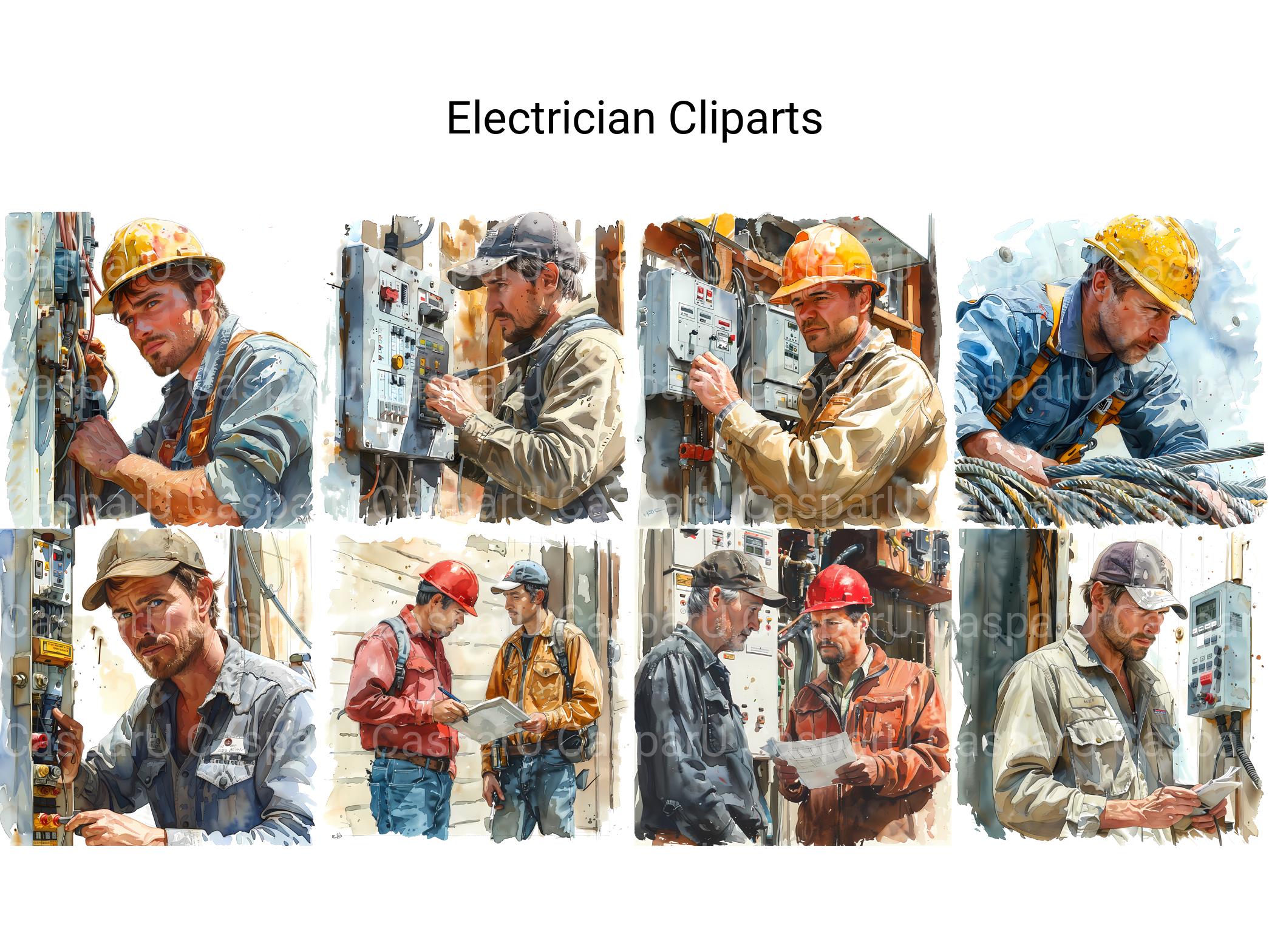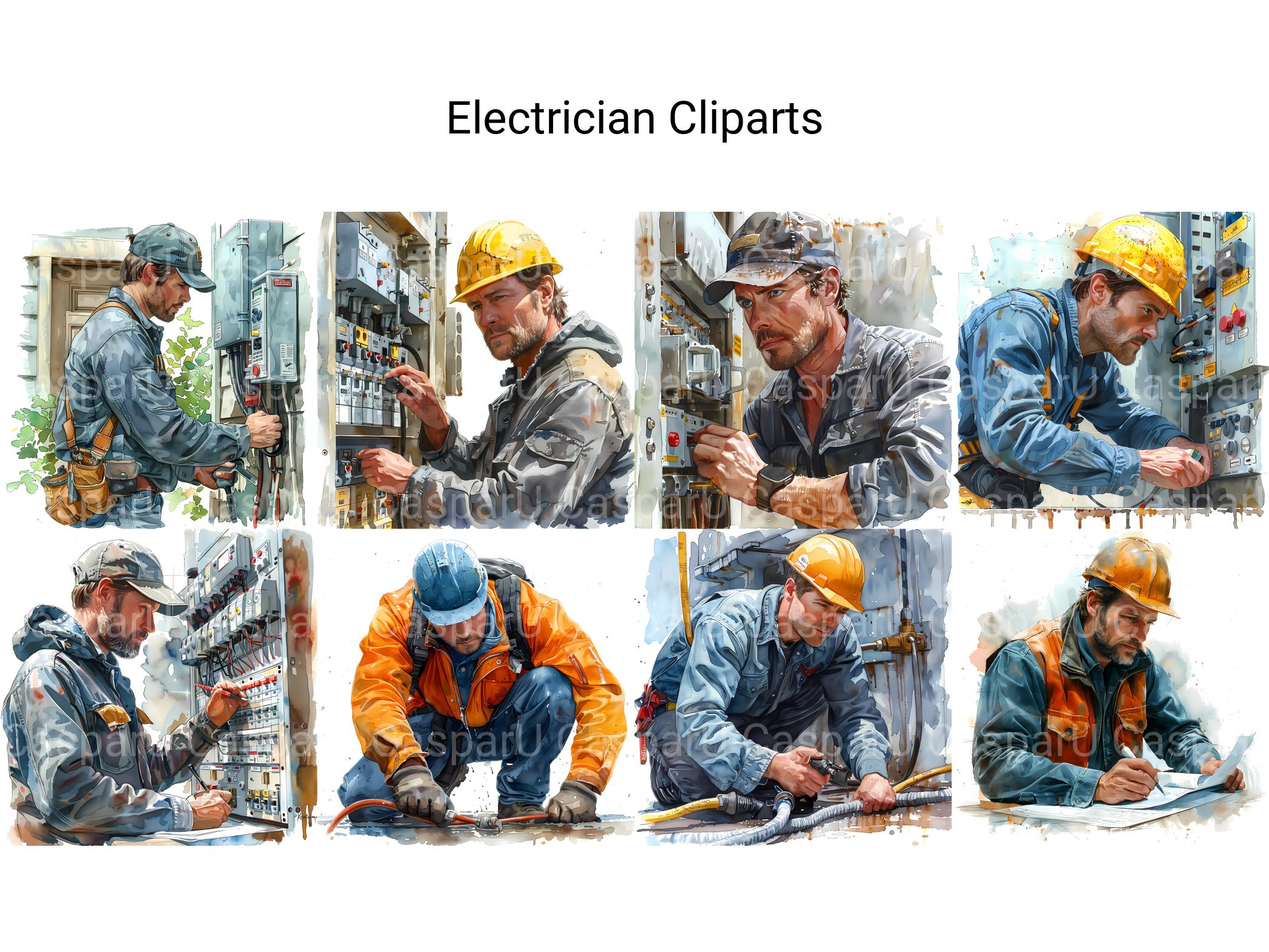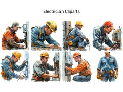 Our electrician-themed digital cliparts feature wiring diagrams, electrical tools, and light bulbs. Perfect for enhancing presentations, educational materials, and DIY projects. These cliparts highlight the technical skill and precision of electricians.