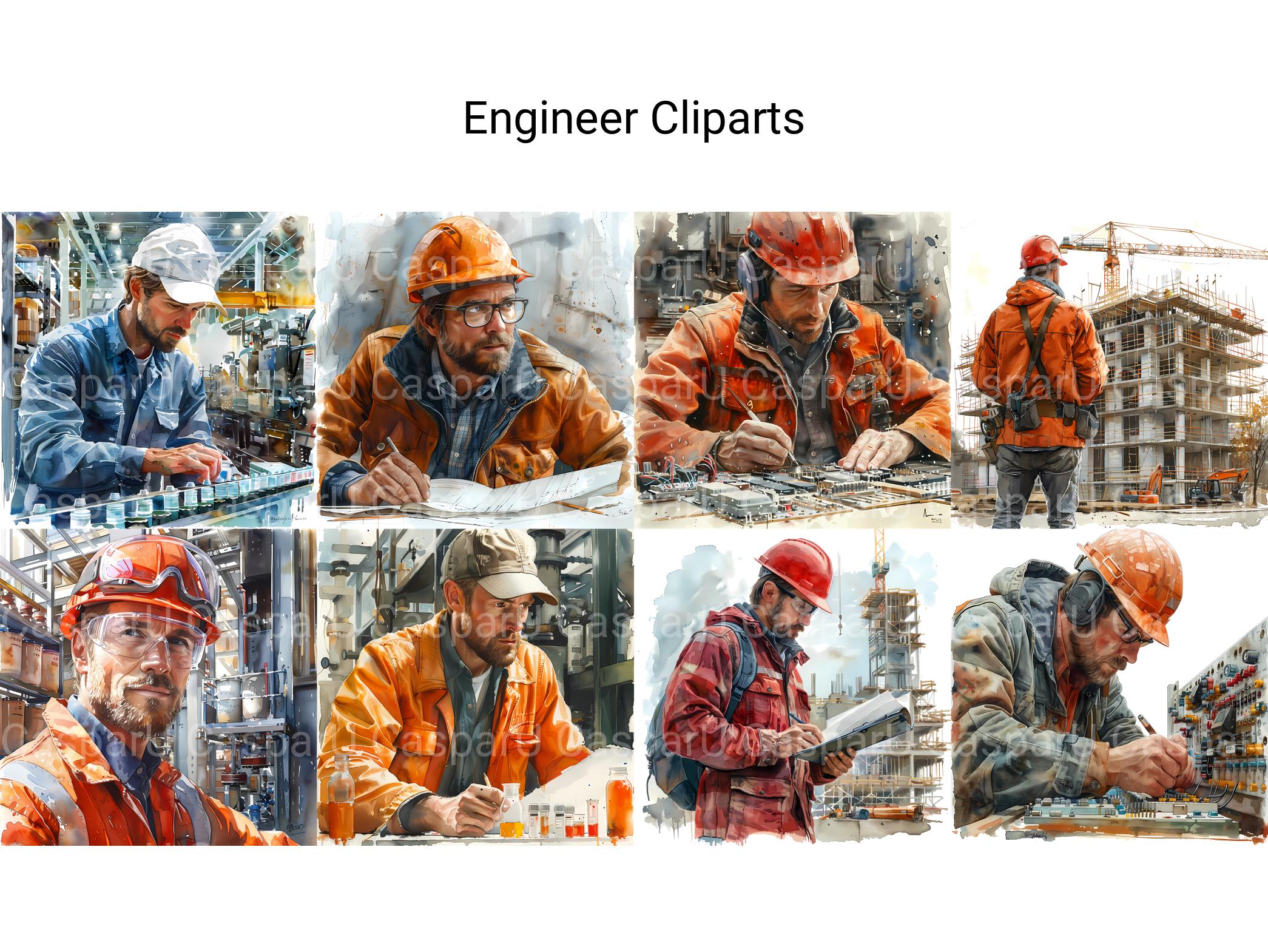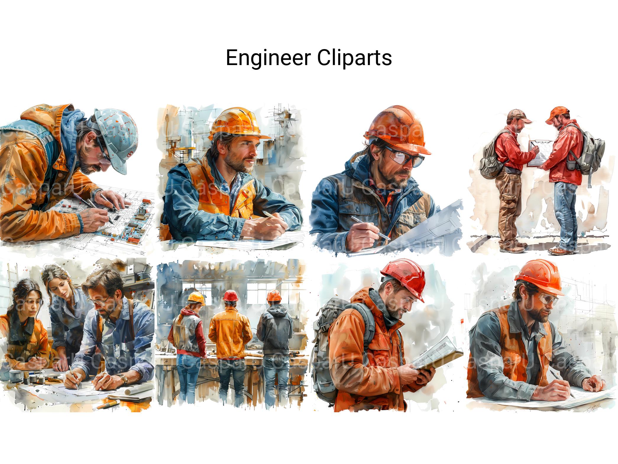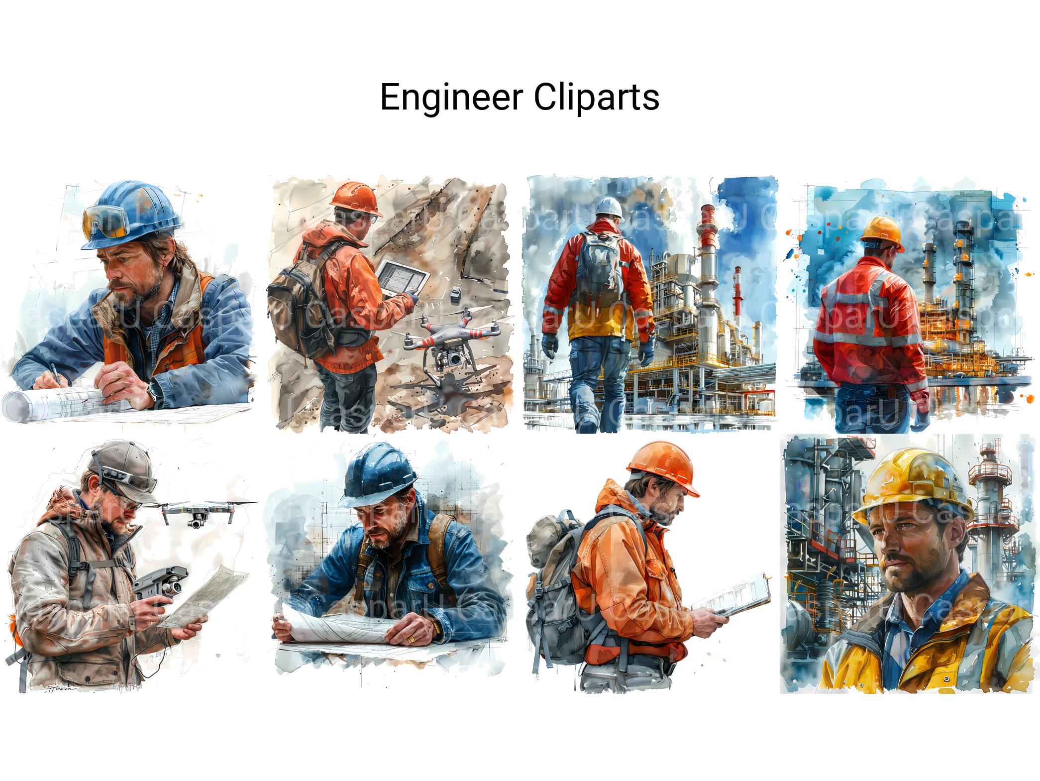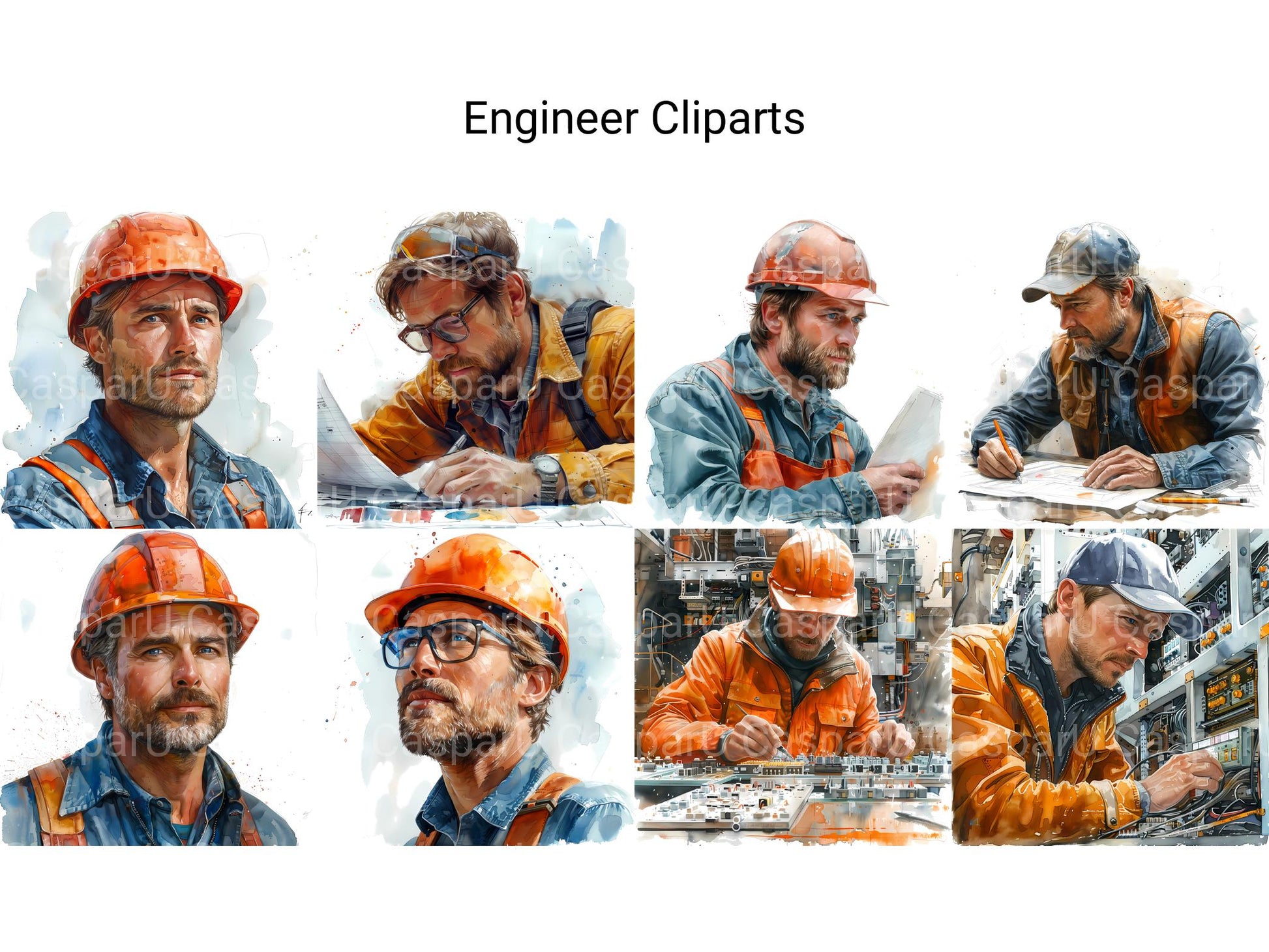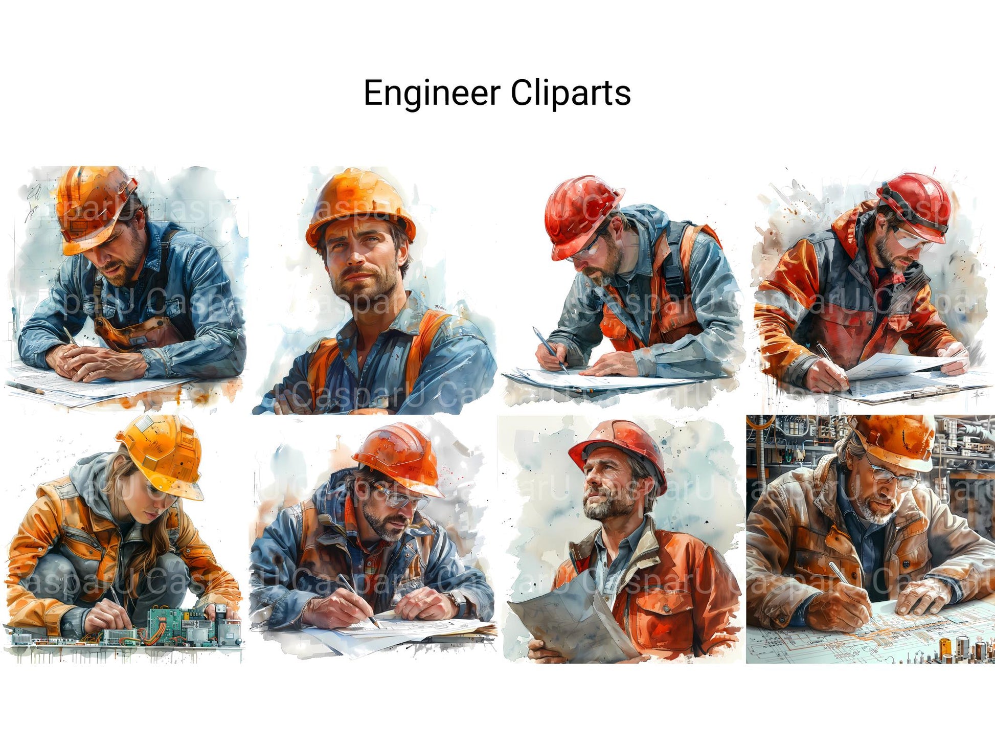 This engineer-themed digital clipart collection includes gears, blueprints, and technical instruments. Ideal for project plans, technical blogs, and educational content. These cliparts capture the essence of engineering innovation and problem-solving.