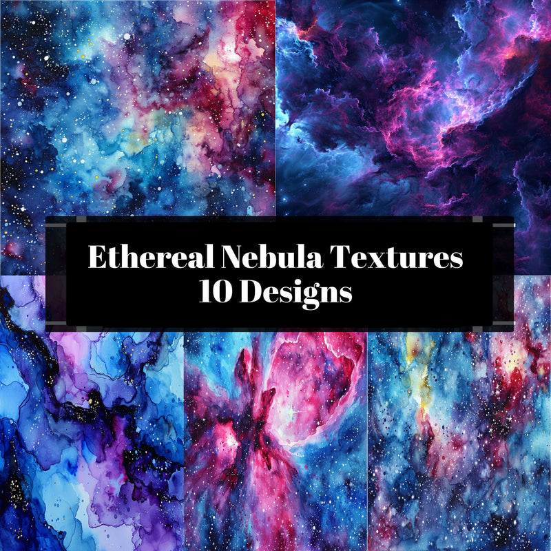 Drift away with this Ethereal Nebula Textures set, featuring cosmic patterns, perfect for dreamy designs.