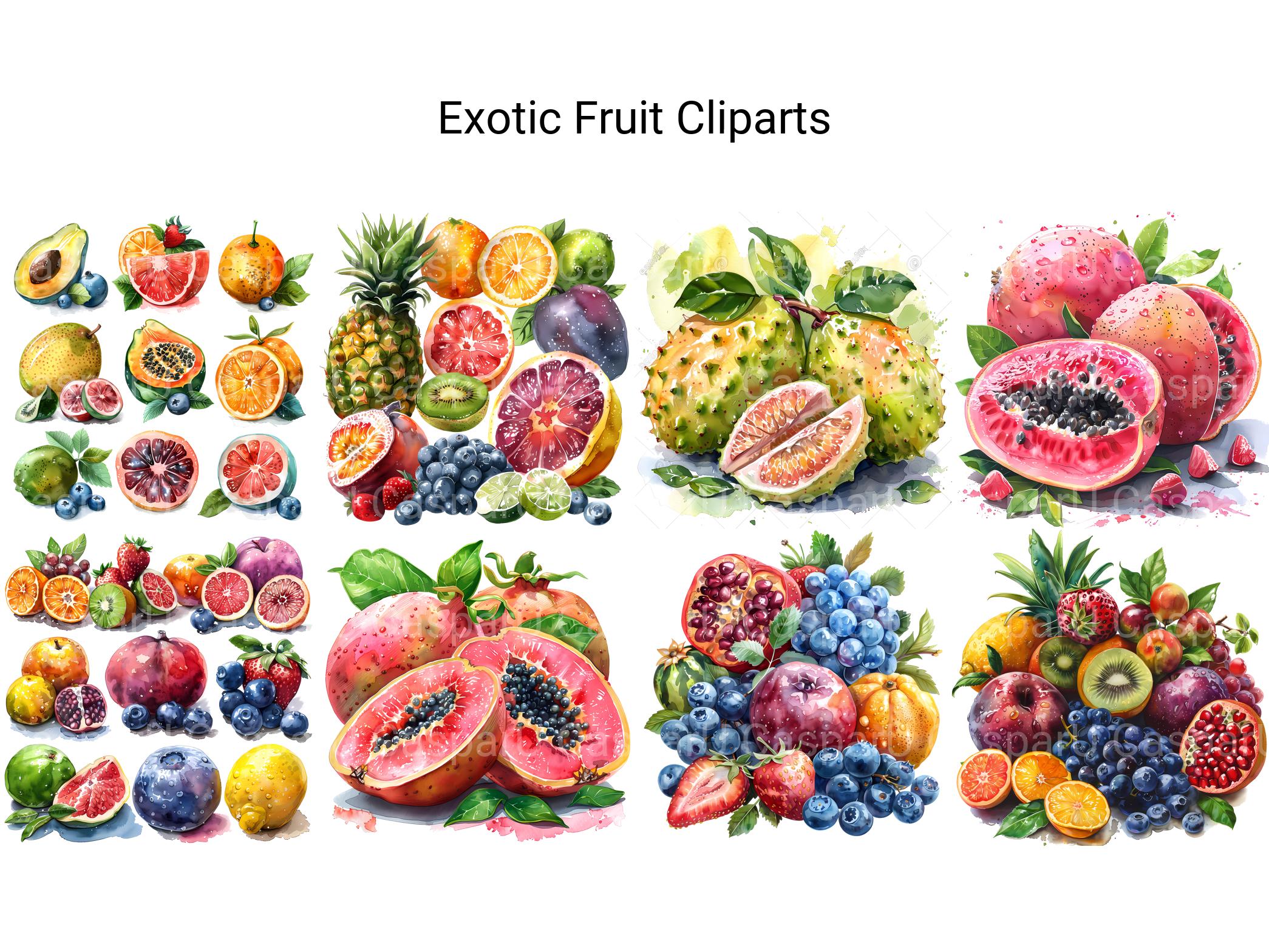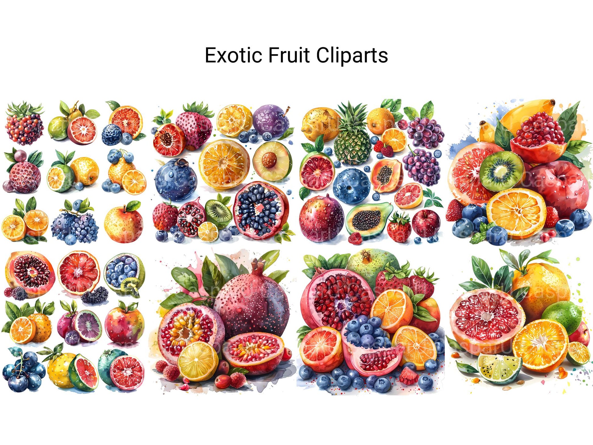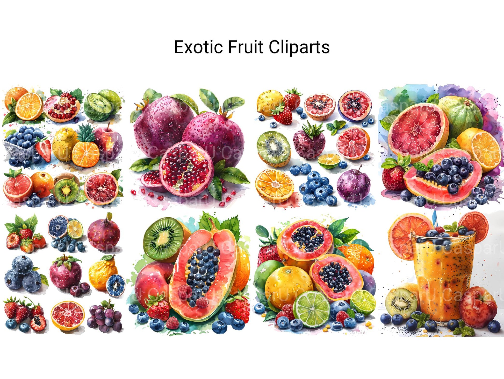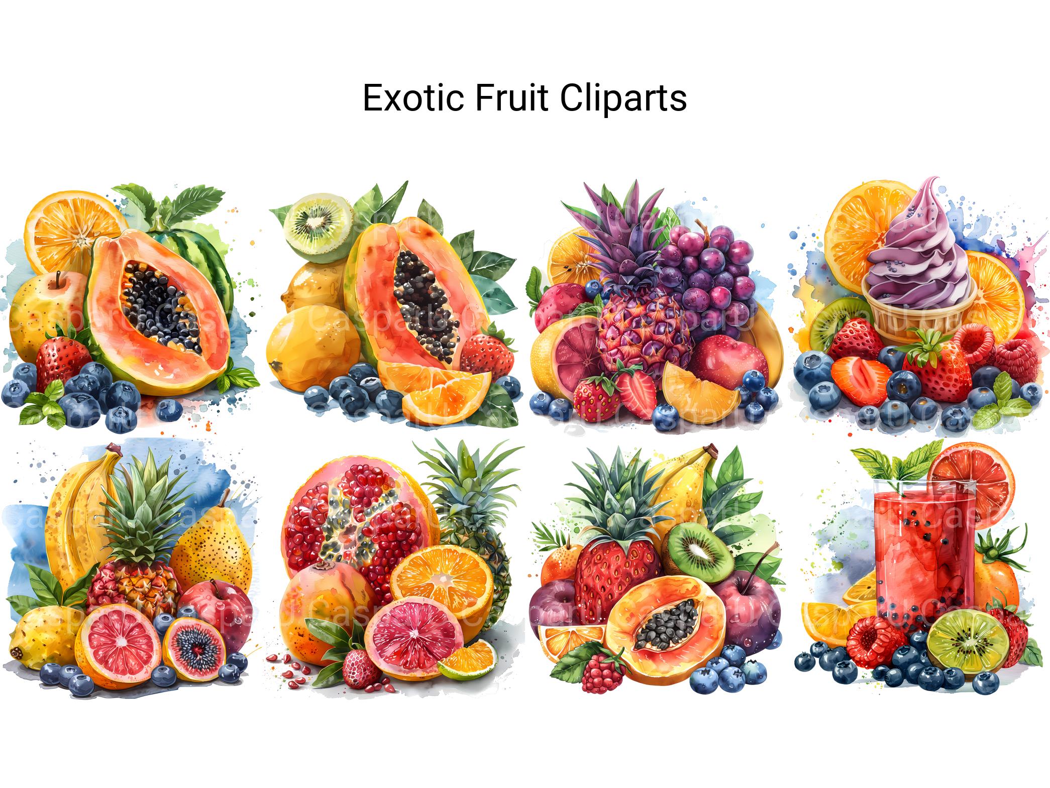 Explore a world of vibrant colors with our Exotic Fruit clipart. This collection features a variety of tropical fruits, such as dragon fruit and kiwi, adding a lively and colorful touch to your designs. Perfect for summer or exotic-themed projects.