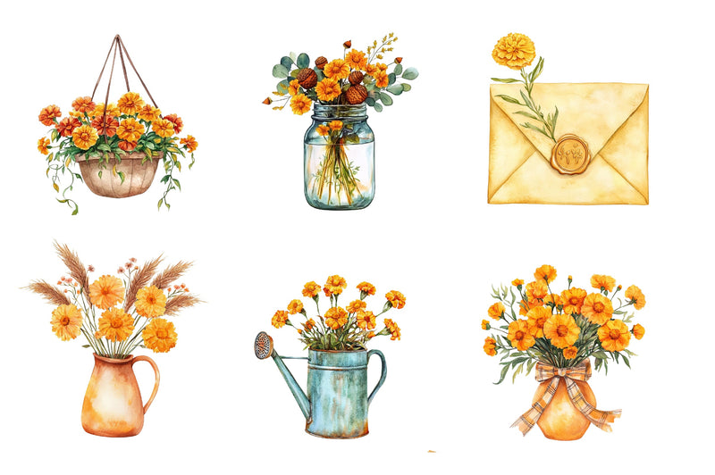 Bloom with this Fall Marigold Clipart Bundle, featuring autumn flower designs, ideal for fall flower crafts.