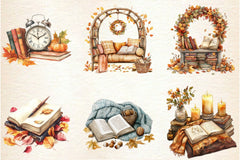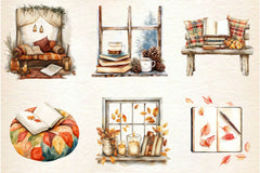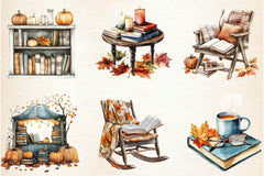 Cozy with this Fall Reading Nook Clipart Bundle, featuring autumn reading corner designs, perfect for seasonal book crafts.