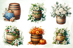 Store with this Floral Barrel Clipart Bundle, featuring flower barrel designs, ideal for garden storage crafts.