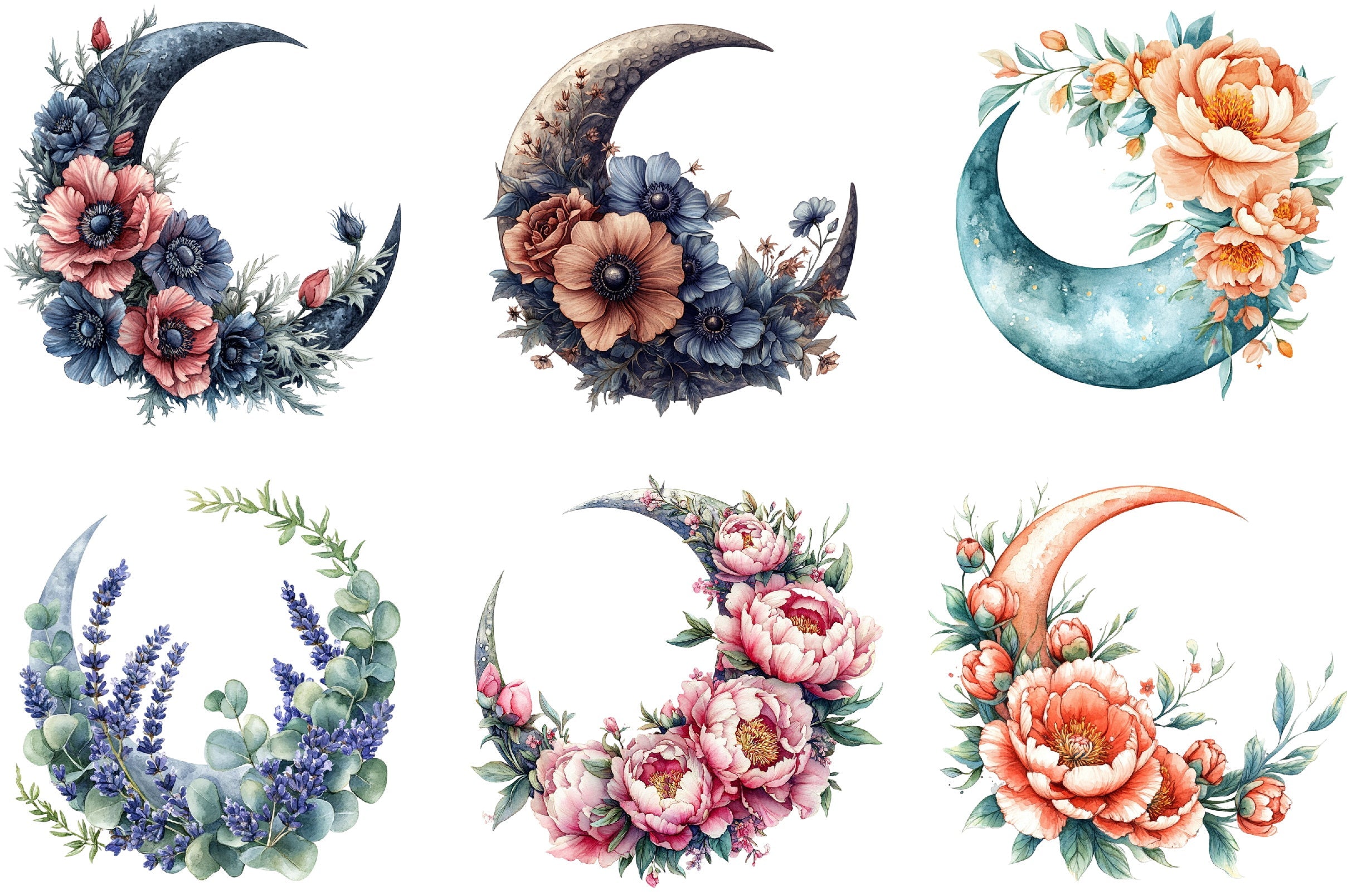 Elevate your crafts with stunning floral moon illustrations, perfect for digital scrapbooking and personalized gifts.