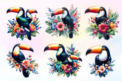 Beautiful toucans decorated with flowers for tropical nature projects.