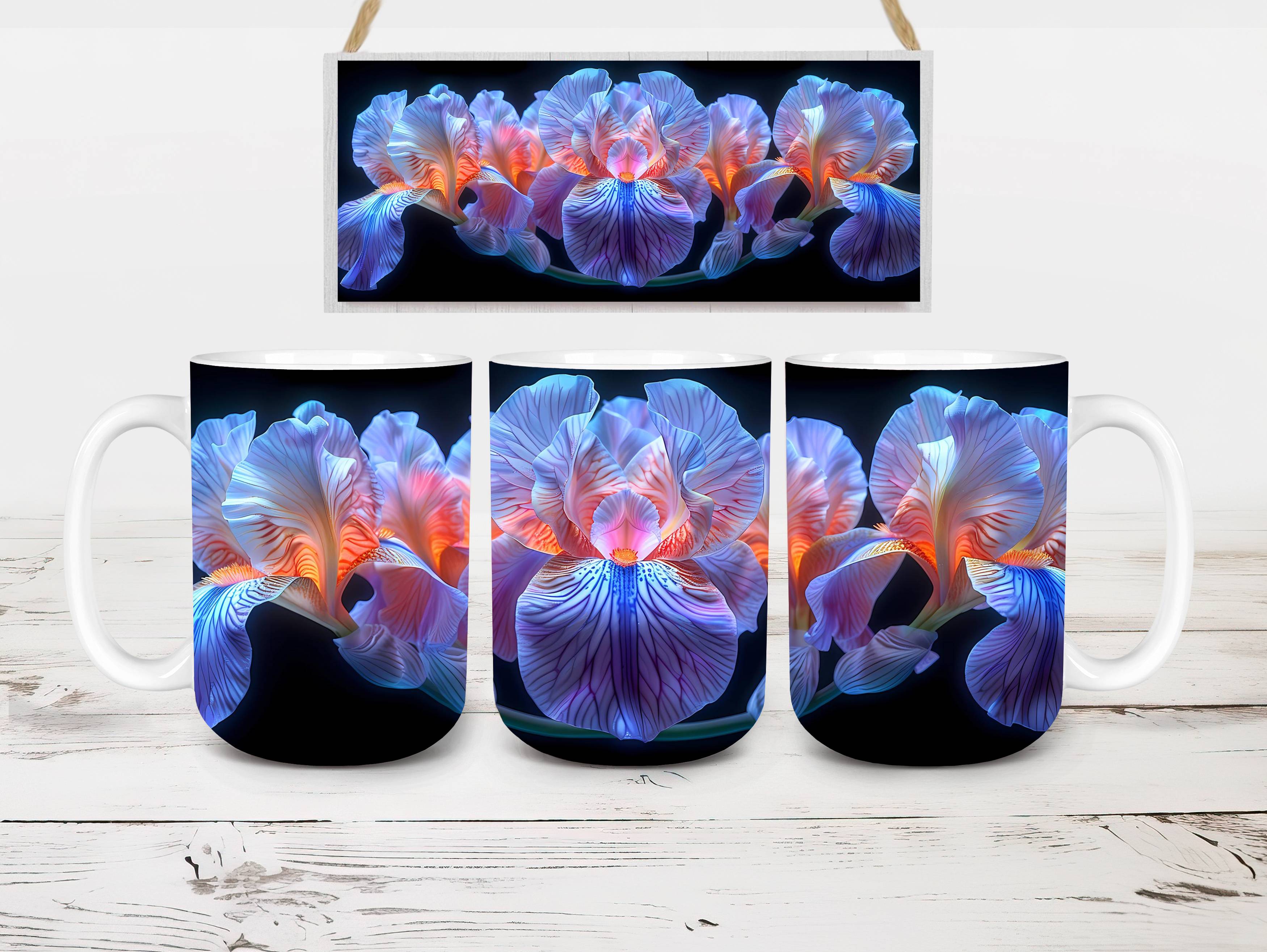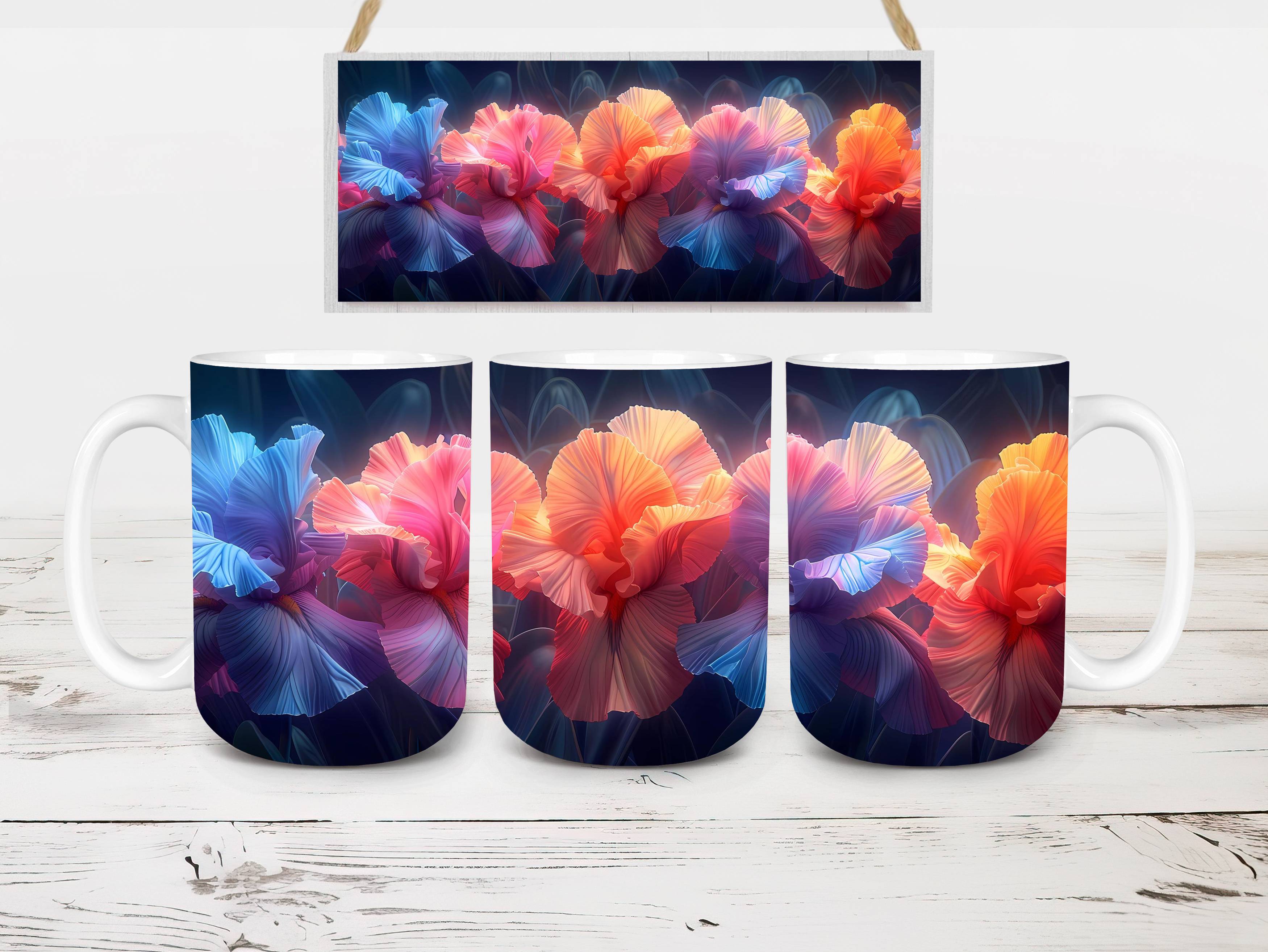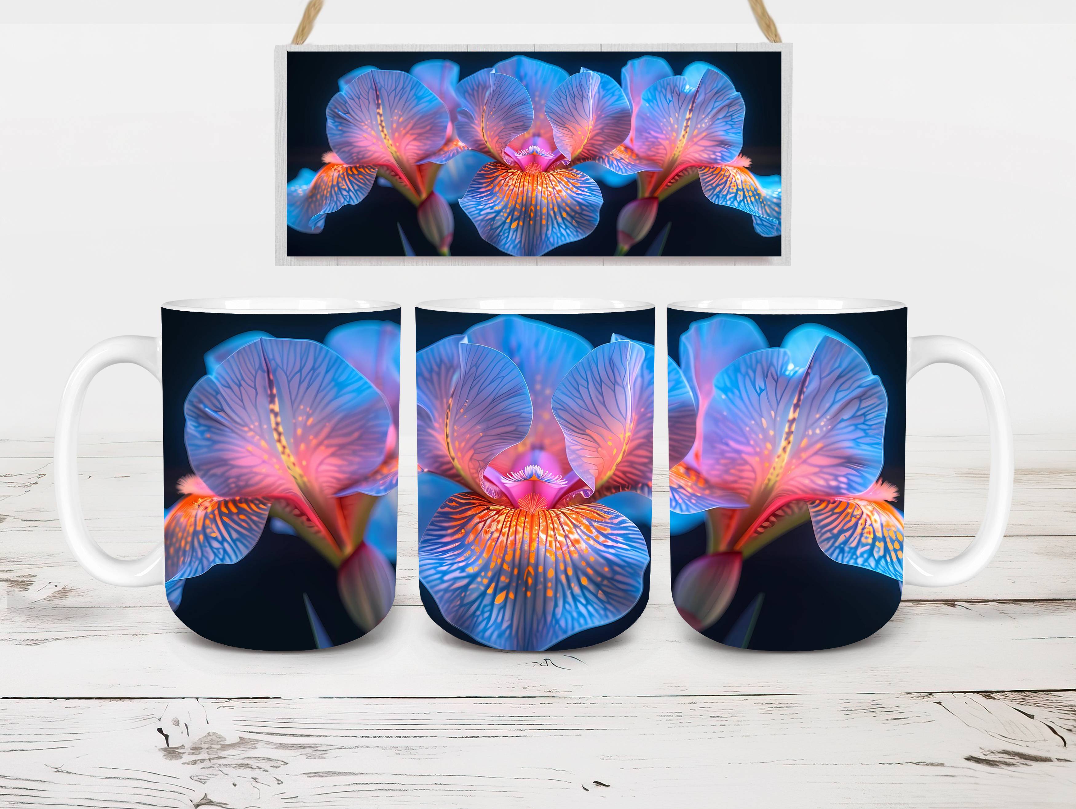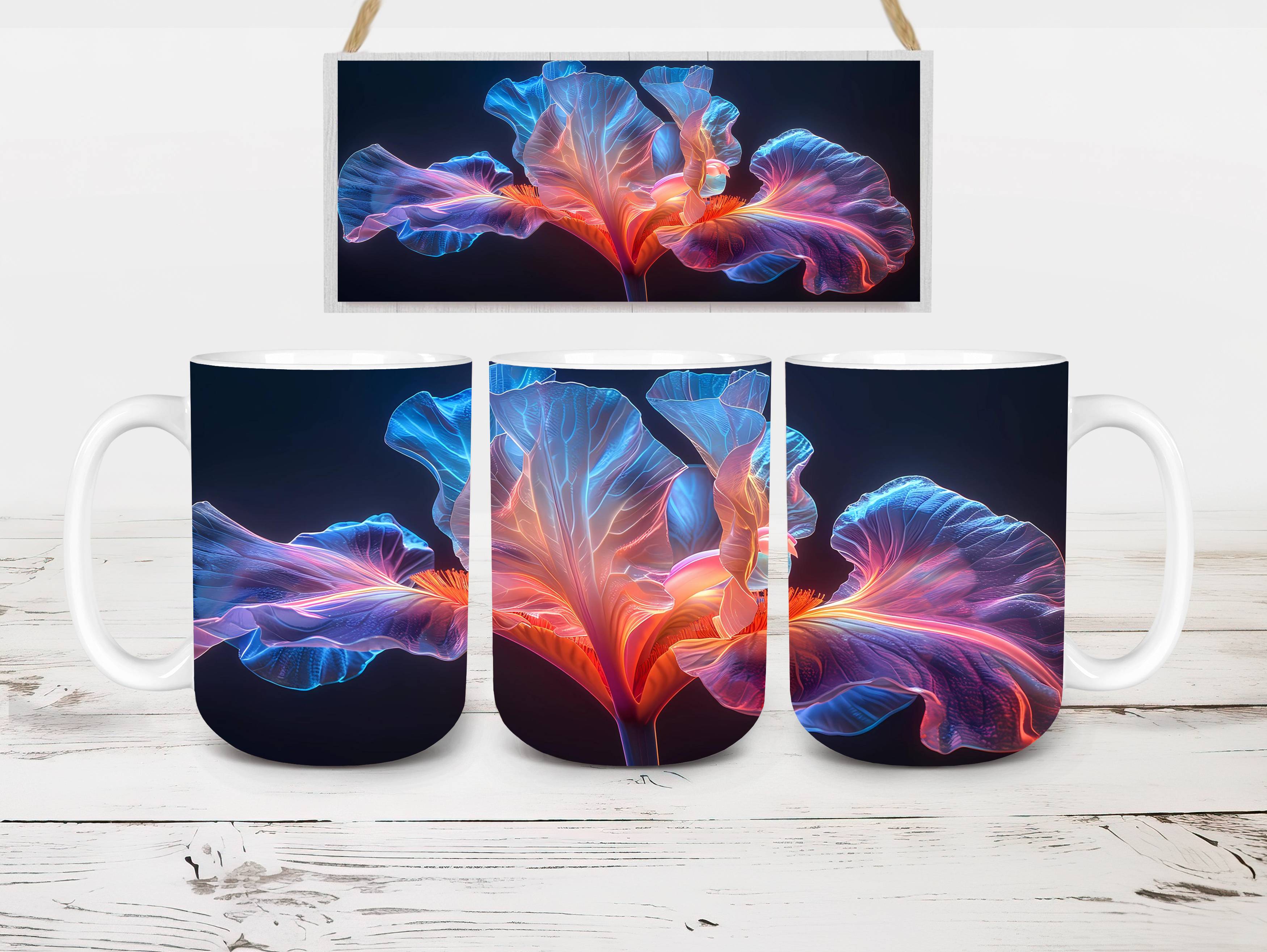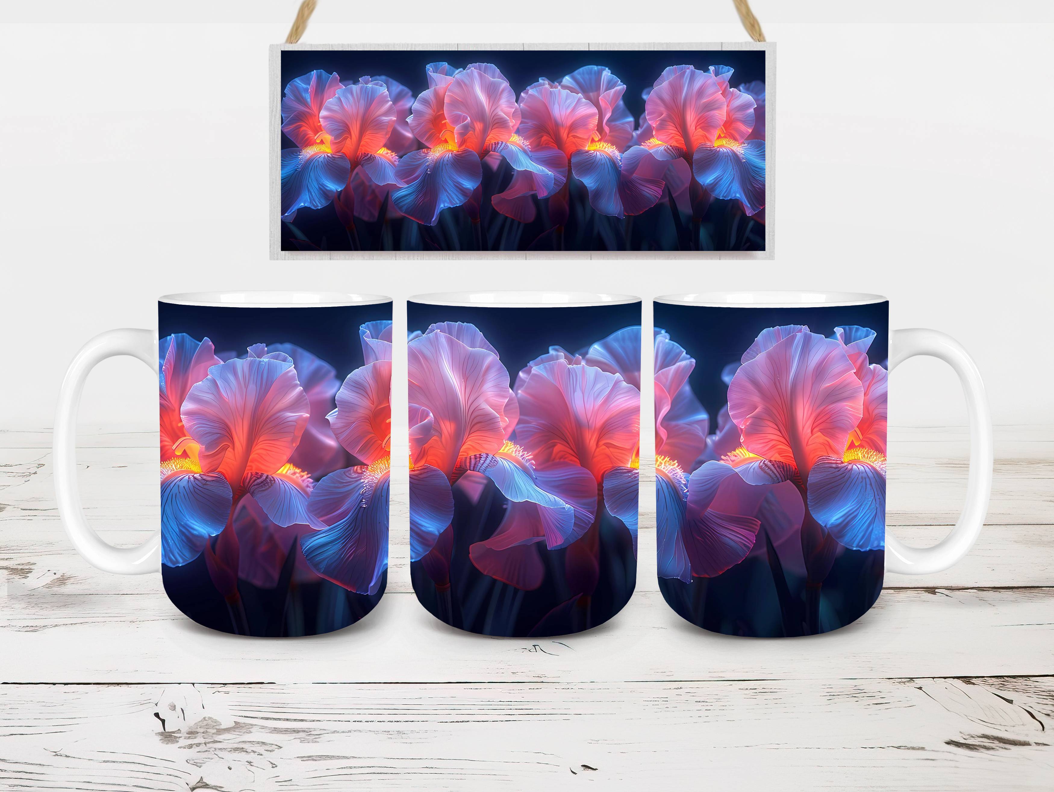 Embrace the elegance of Flower Irises digital mug wraps, featuring stunning iris illustrations. These wraps add a touch of sophistication to your coffee or tea time, making each sip a moment of refined indulgence. Sip from these delightful mug wraps and immerse yourself in the serene ambiance created by the graceful irises, adding a touch of elegance to your daily routine.