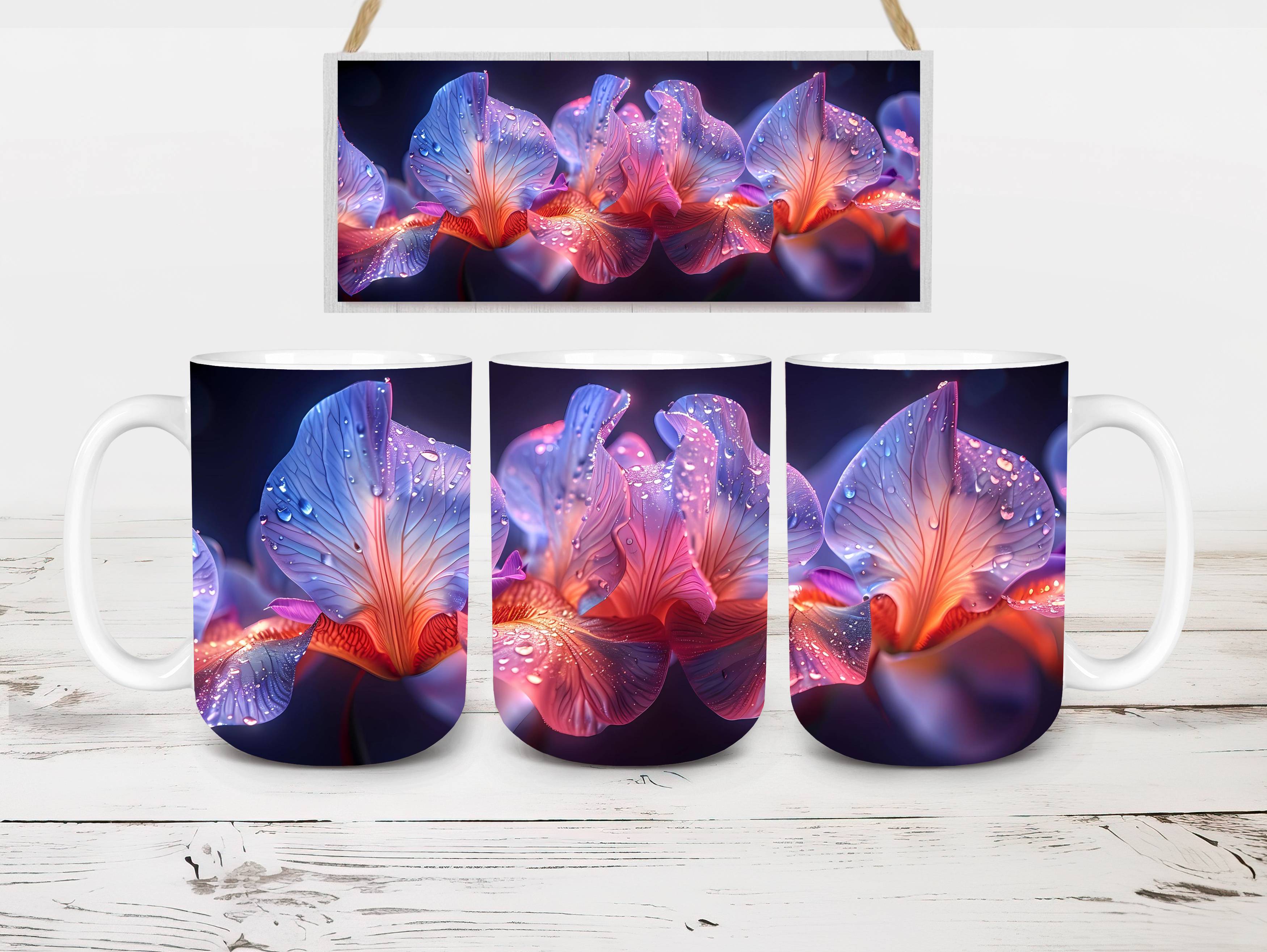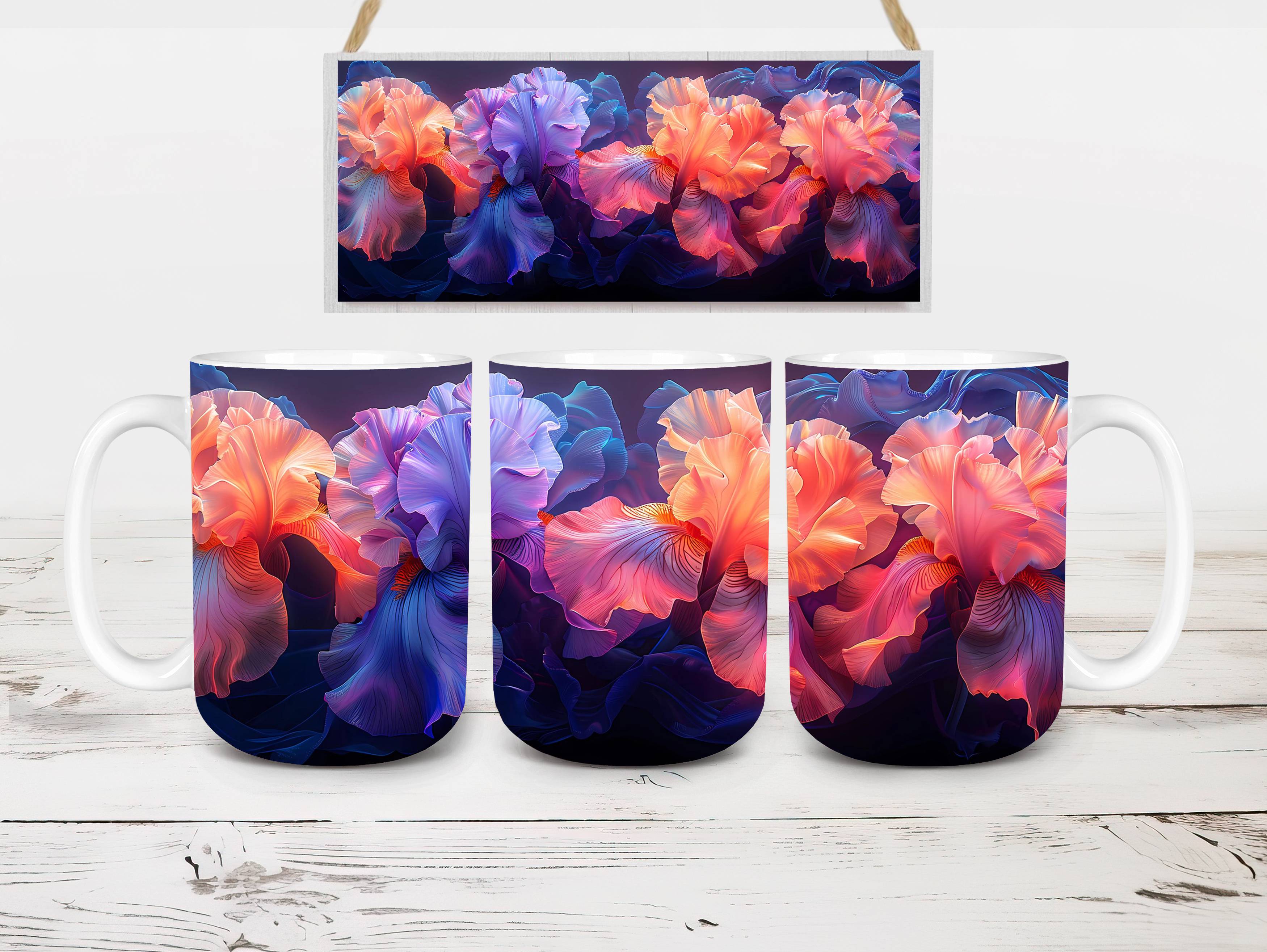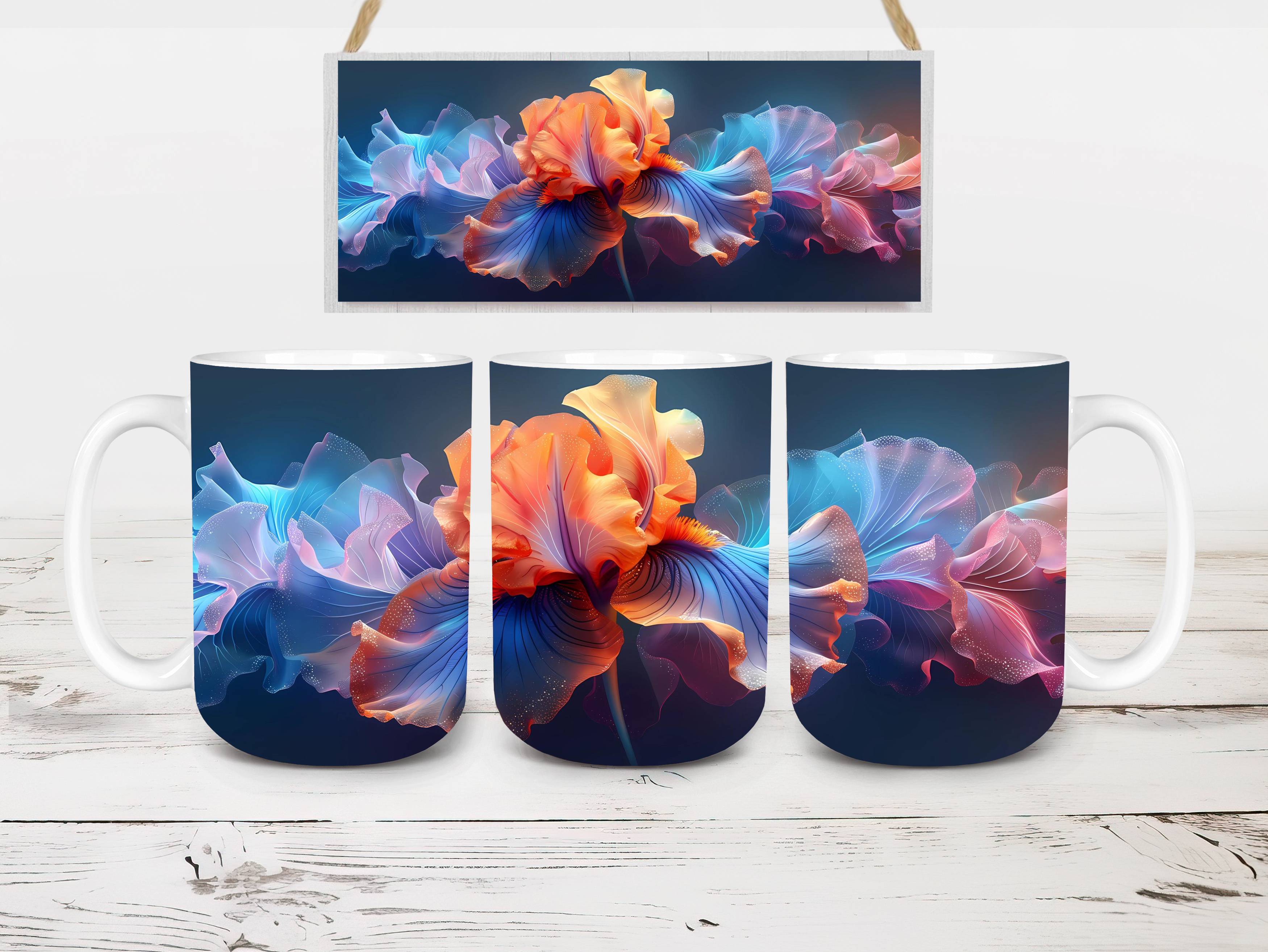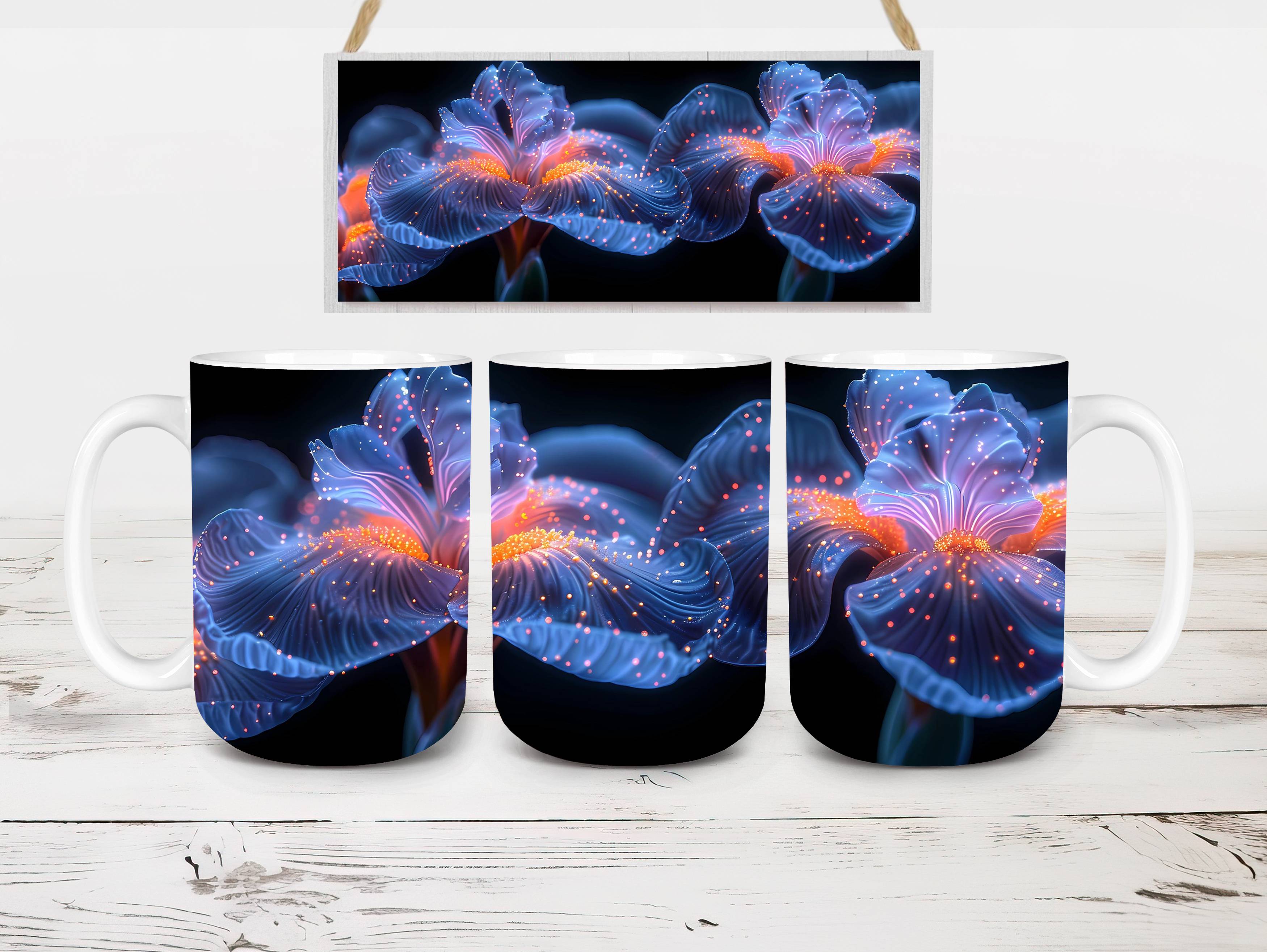 Embrace the elegance of Flower Irises digital mug wraps, featuring stunning iris illustrations. These wraps add a touch of sophistication to your coffee or tea time, making each sip a moment of refined indulgence. Sip from these delightful mug wraps and immerse yourself in the serene ambiance created by the graceful irises, adding a touch of elegance to your daily routine.
