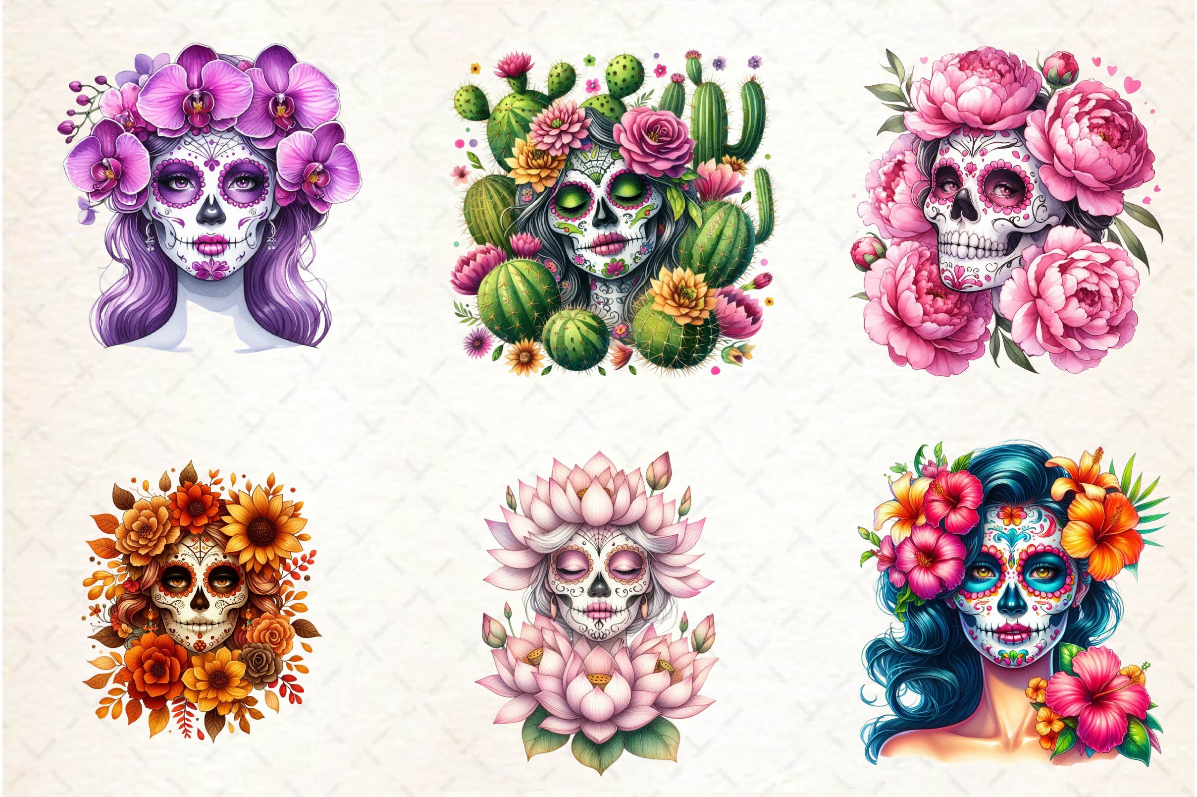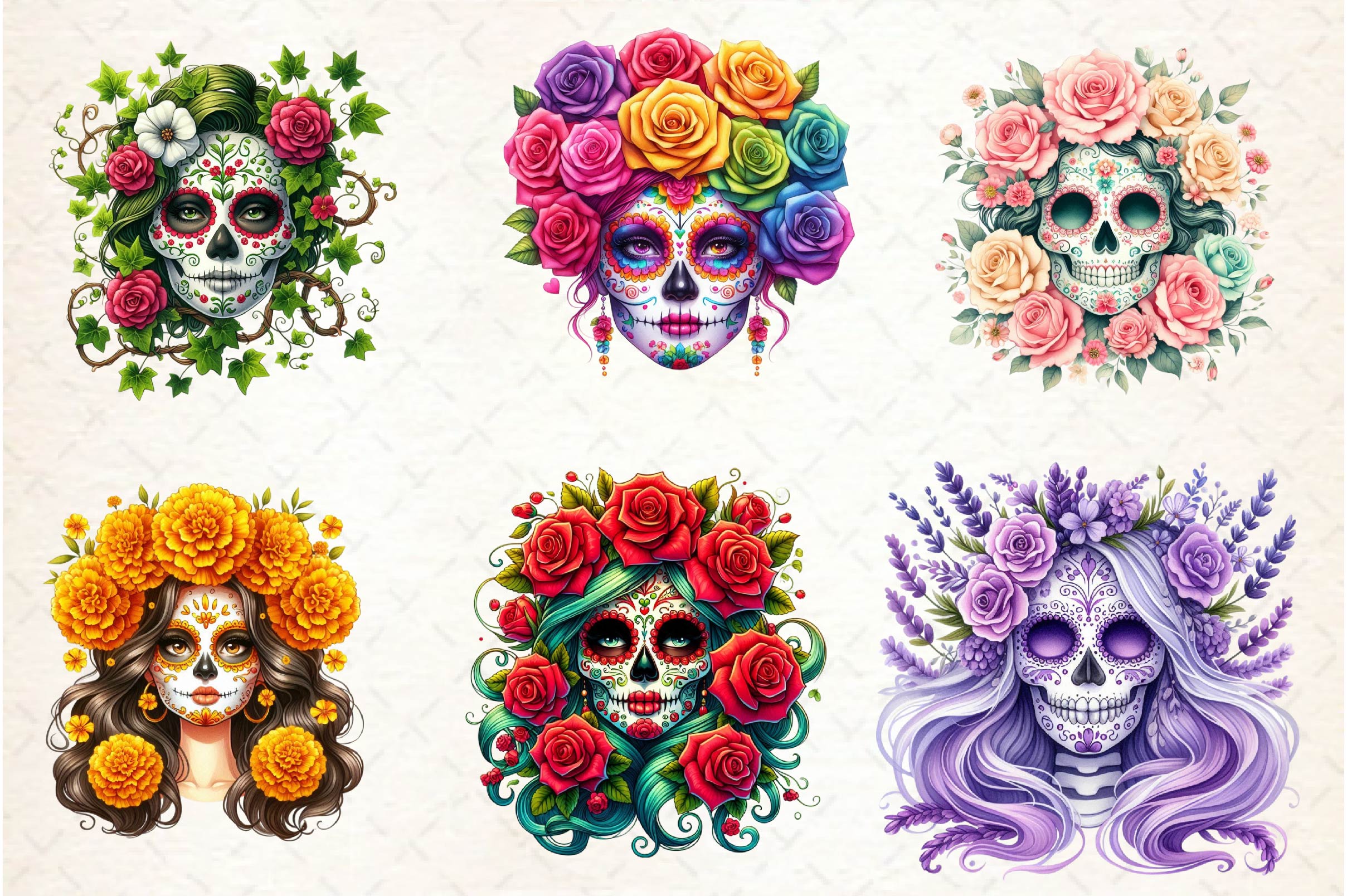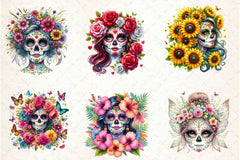 Honor with this Flowers Sugar Skull Girl Clipart Bundle, featuring cultural floral designs, perfect for Halloween flower crafts.