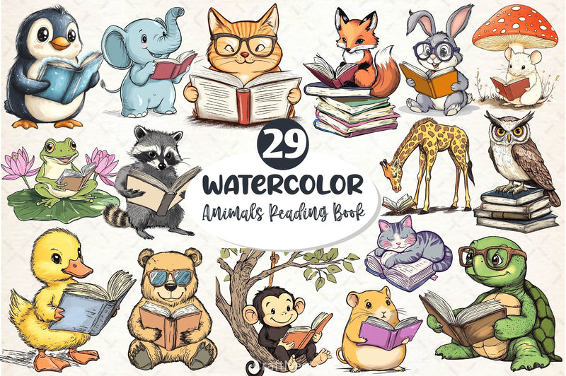 Study with this Funny Animals Reading Book Clipart Bundle, featuring scholarly creature designs, perfect for educational animal crafts.