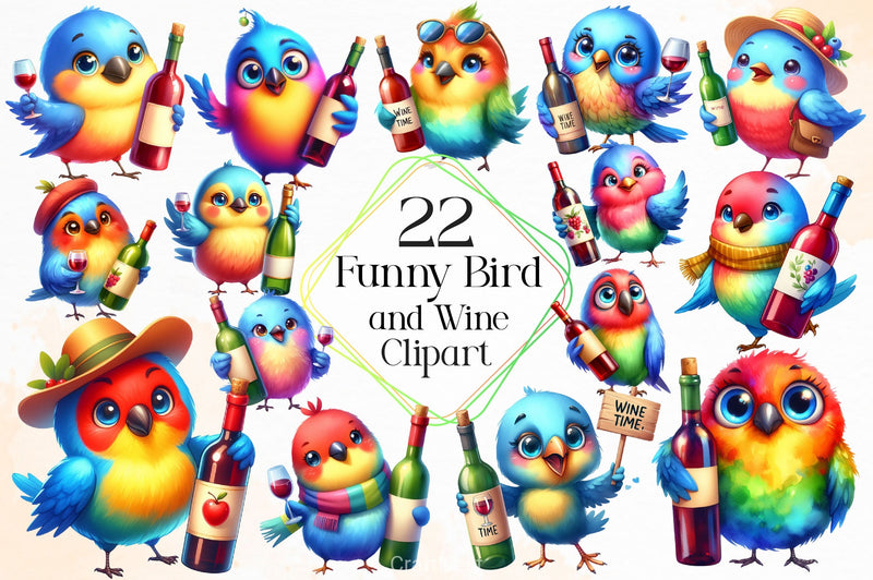 Amusing birds with wine themes for humorous adult beverage projects.
