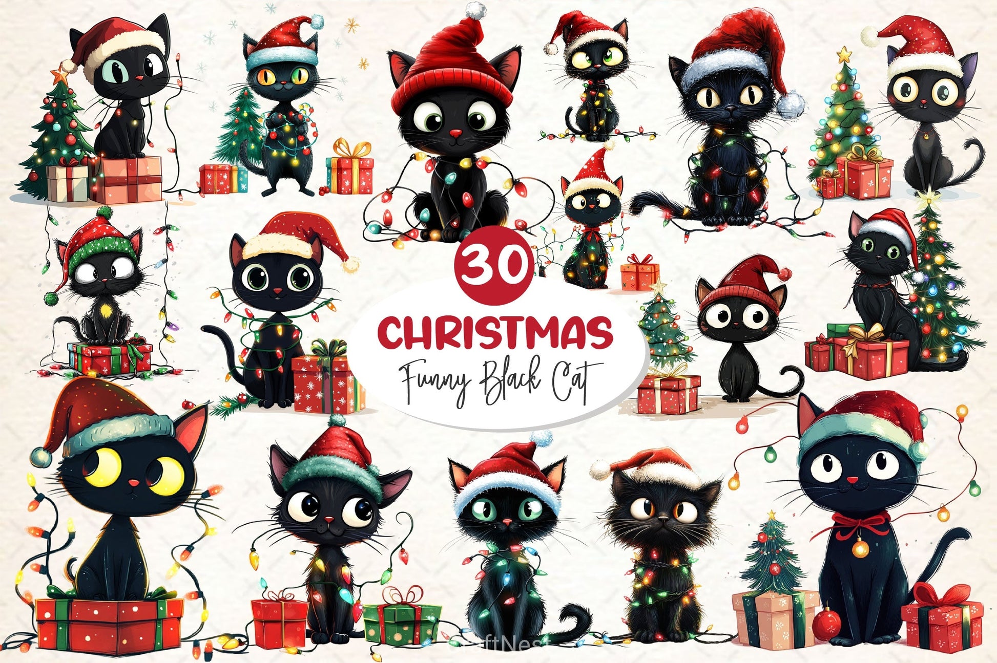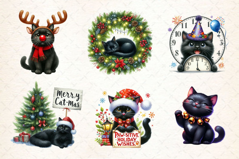 Purr with this Funny Christmas Black Cat Clipart Bundle, featuring humorous holiday feline designs, perfect for pet Christmas comedy crafts.