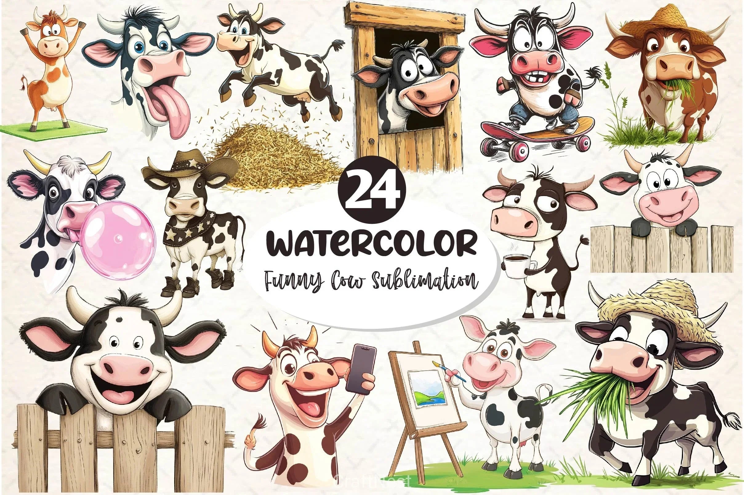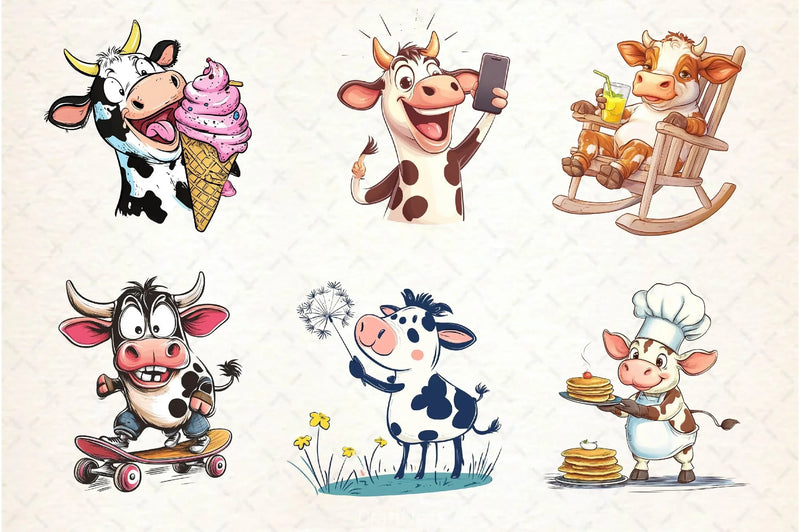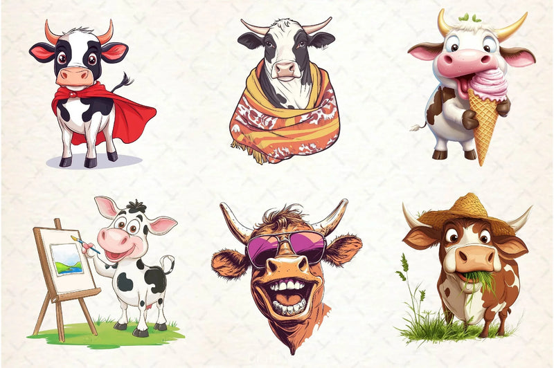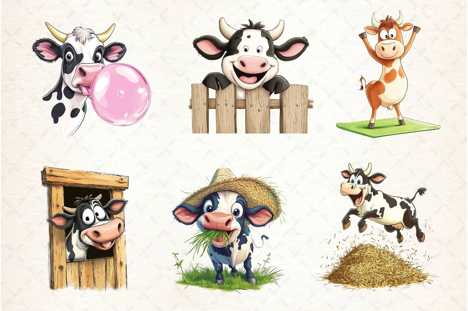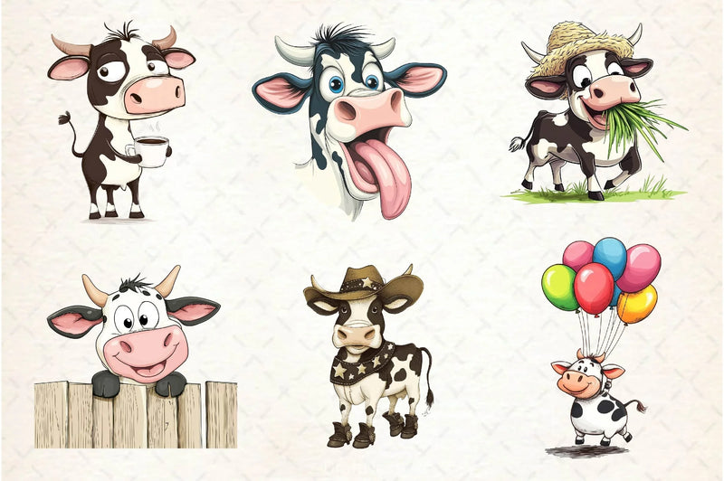 Discover the charm of our Funny Cow Clipart Bundle, featuring whimsical cow designs perfect for adding a playful touch to your creative projects, from farm-themed crafts to unique digital artwork.