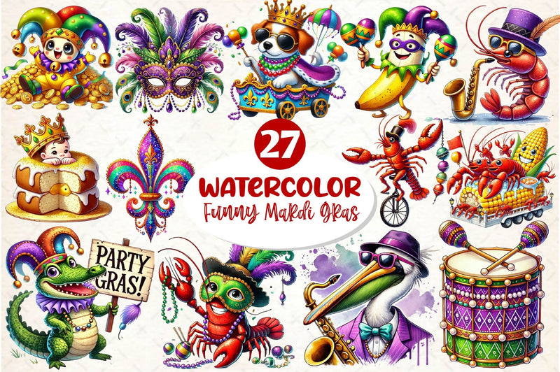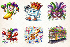 Parade with this Funny Mardi Gras Clipart Bundle, featuring festive carnival designs, perfect for New Orleans celebration crafts.