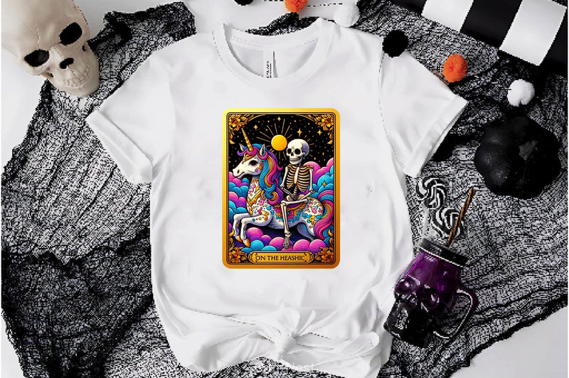 Humorous sarcastic skeleton tarot designs for gothic comedy projects.