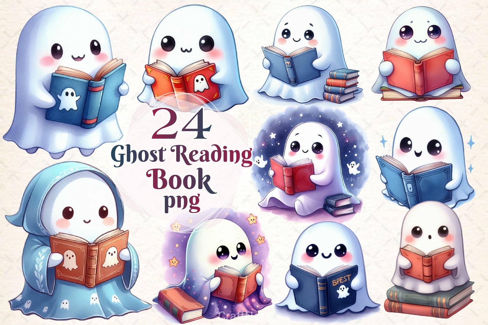 Read with this Ghost Reading Book Clipart Bundle, featuring literary ghost designs, ideal for spooky book lover crafts.