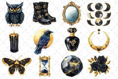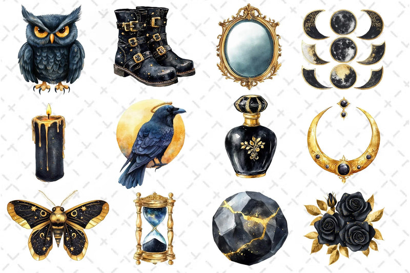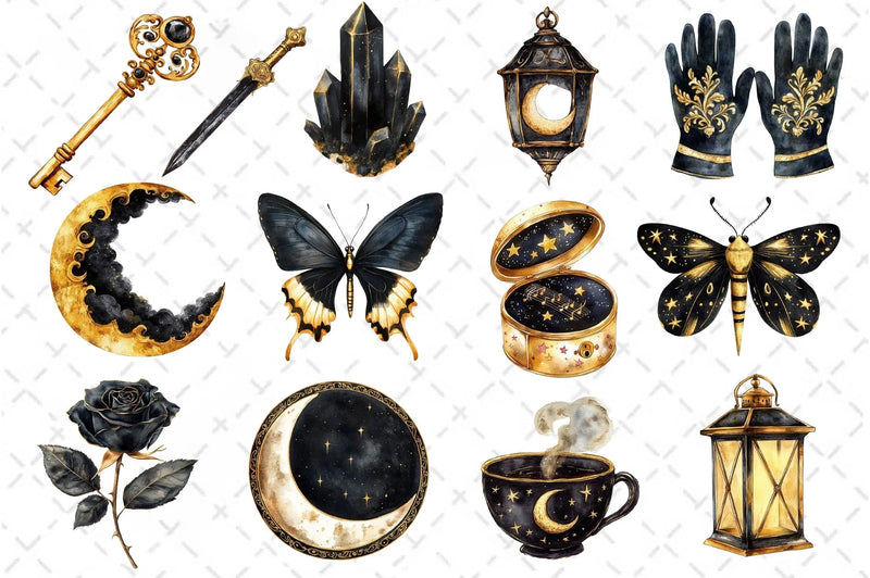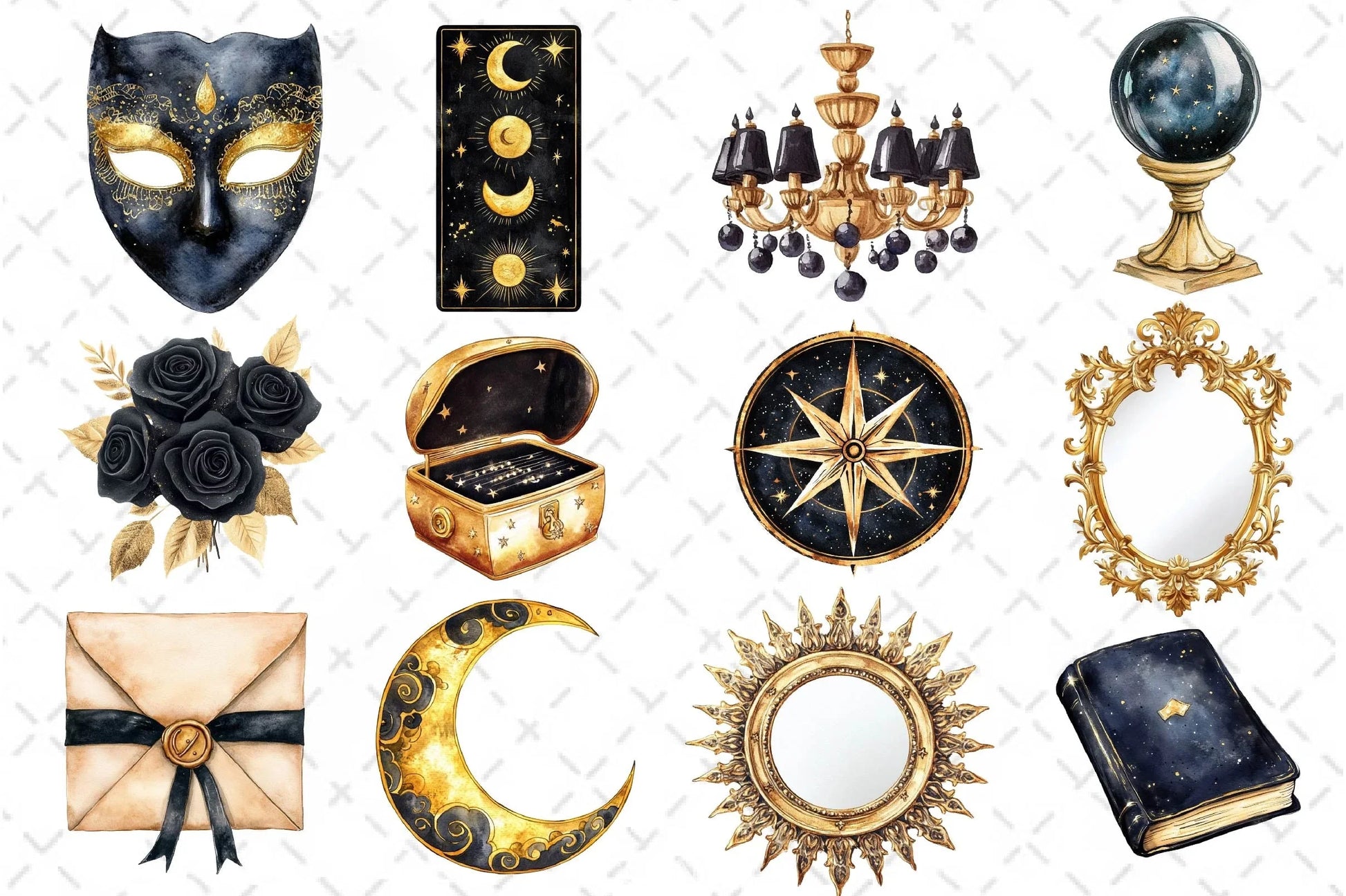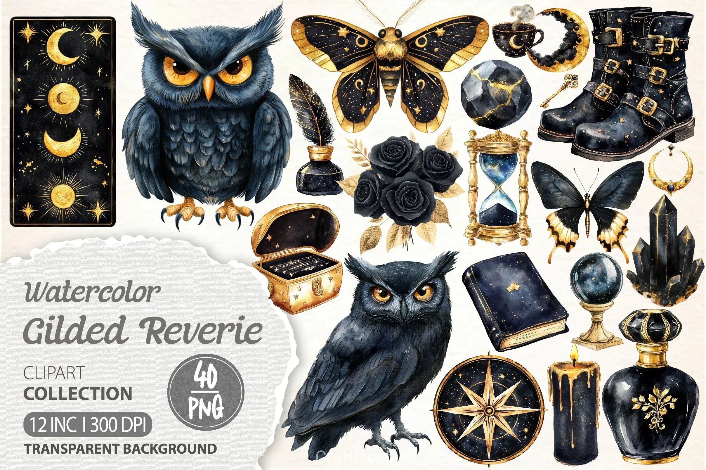 Enhance your creative projects with the Gilded Reverie Clipart Bundle, featuring exquisite, gold-accented designs perfect for elegant invitations, luxurious branding, and sophisticated digital art.