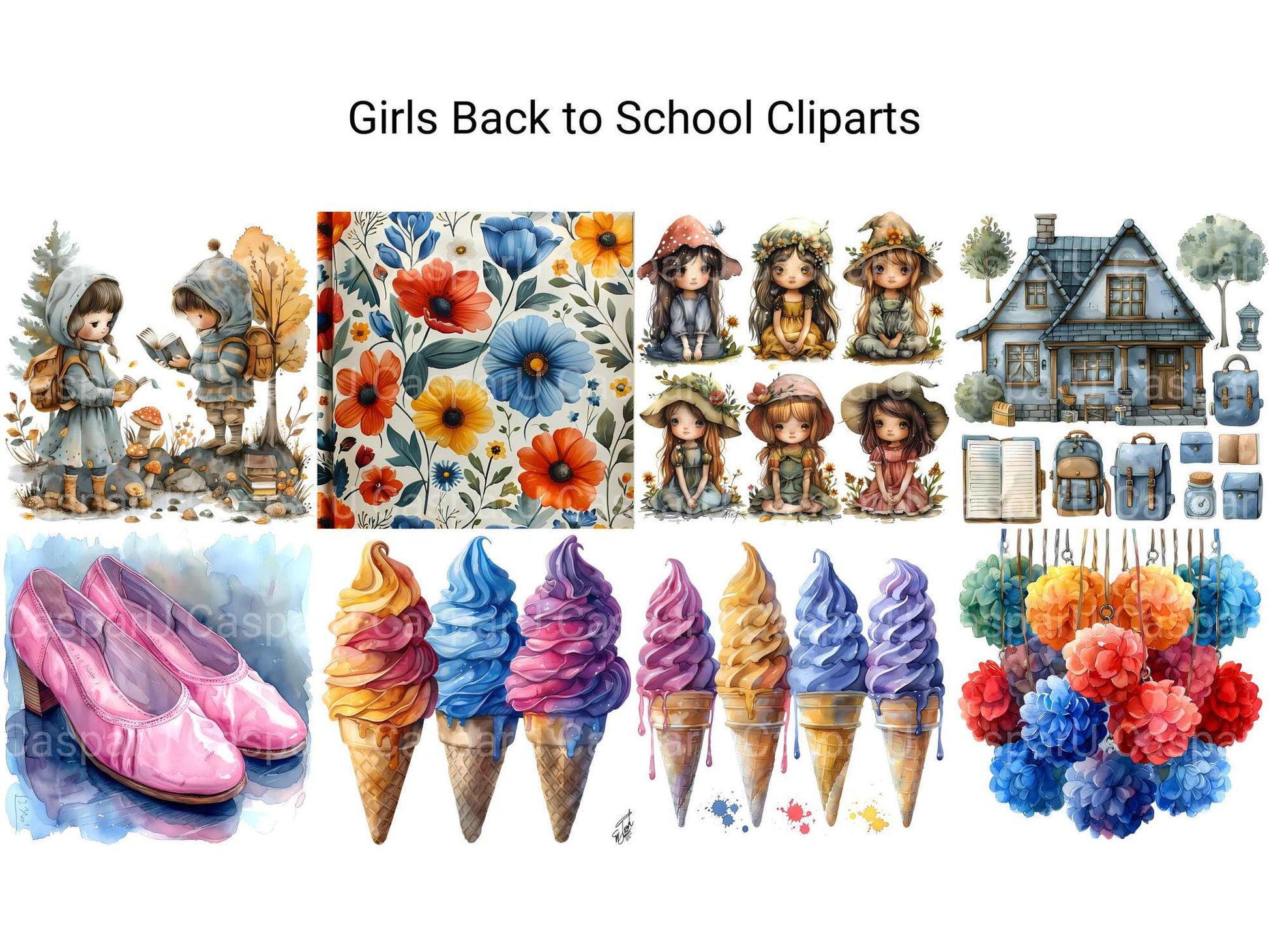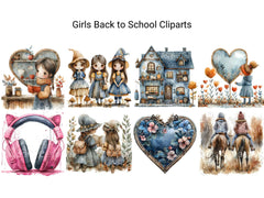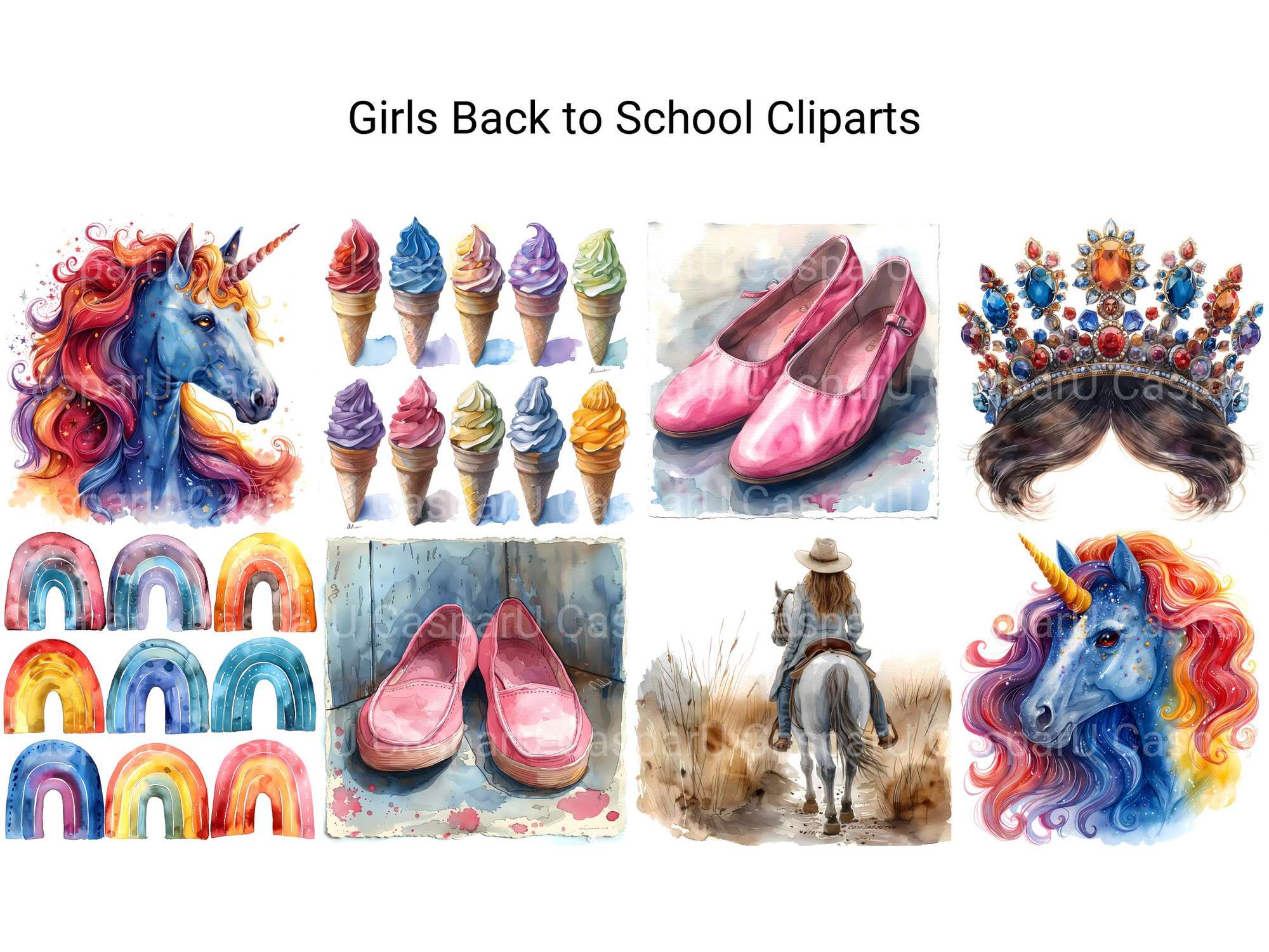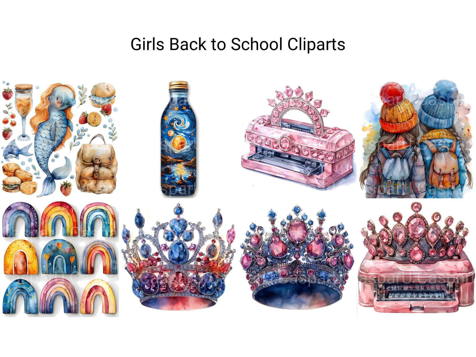 Celebrate the energy and enthusiasm of girls heading back to school with this collection of cliparts. Featuring playful designs and vibrant colors, these illustrations are perfect for girl-focused projects.