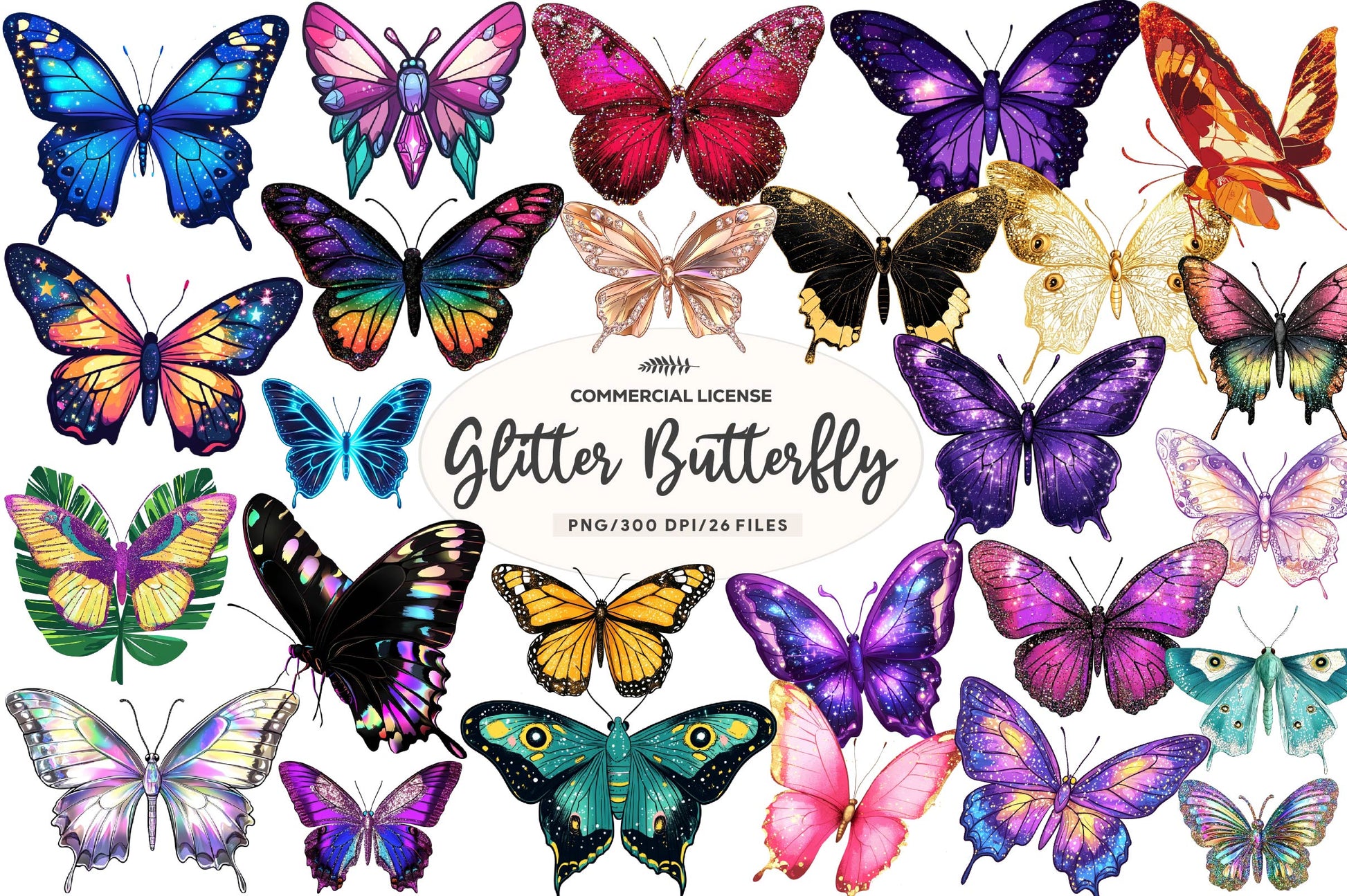 Sparkle with this Glitter Butterfly Clipart Bundle, featuring glittery butterfly designs, perfect for glamorous nature crafts.