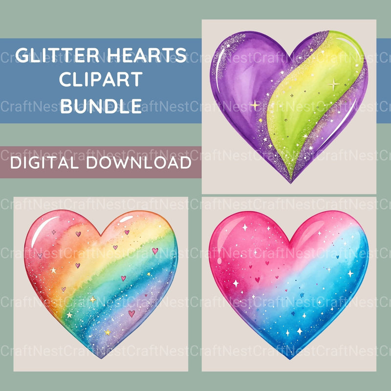 Sparkle with this Glitter Hearts 15 Clipart Bundle, featuring glittery heart designs, ideal for valentine crafts.