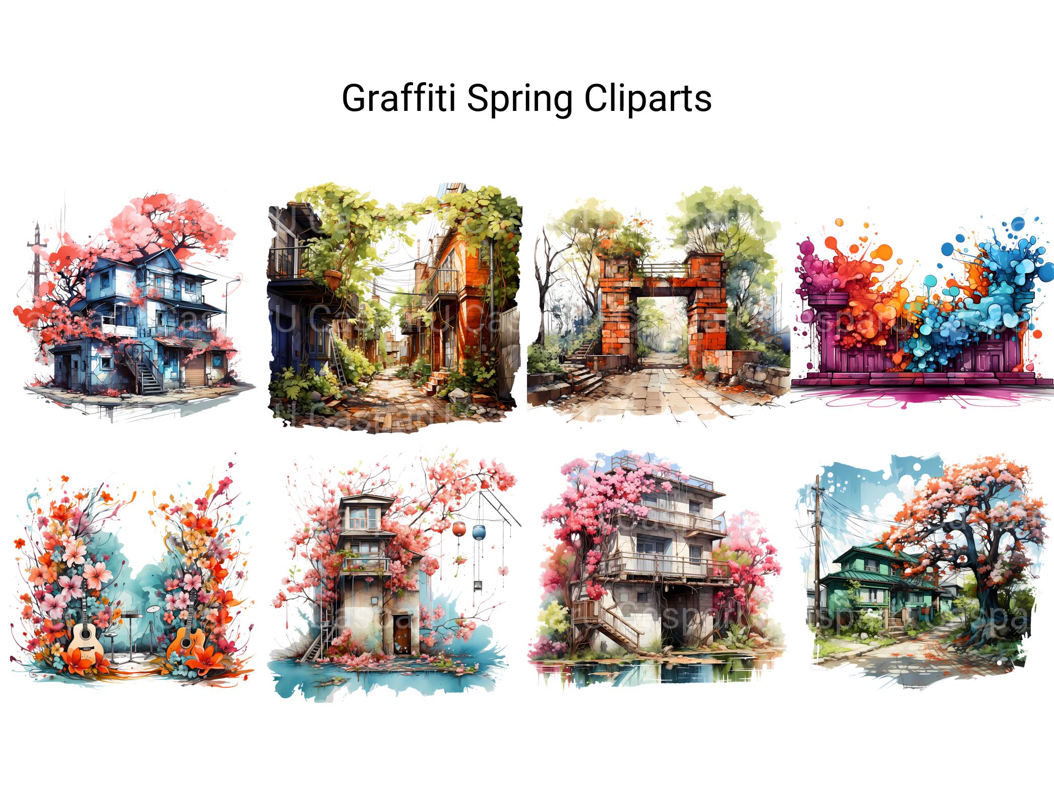 Infuse your designs with urban energy and street art flair with Graffiti Spring digital clip art featuring vibrant and dynamic graffiti designs. From colorful tags to bold lettering, these edgy images capture the spirit of urban culture and artistic expression, perfect for adding a modern and unconventional touch to your spring projects. Let the vibrant colors and bold strokes of Graffiti Spring ignite your creativity and inspire you to embrace the raw energy and creative freedom of street art, inviting viewers to explore the city streets with fresh eyes.