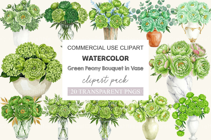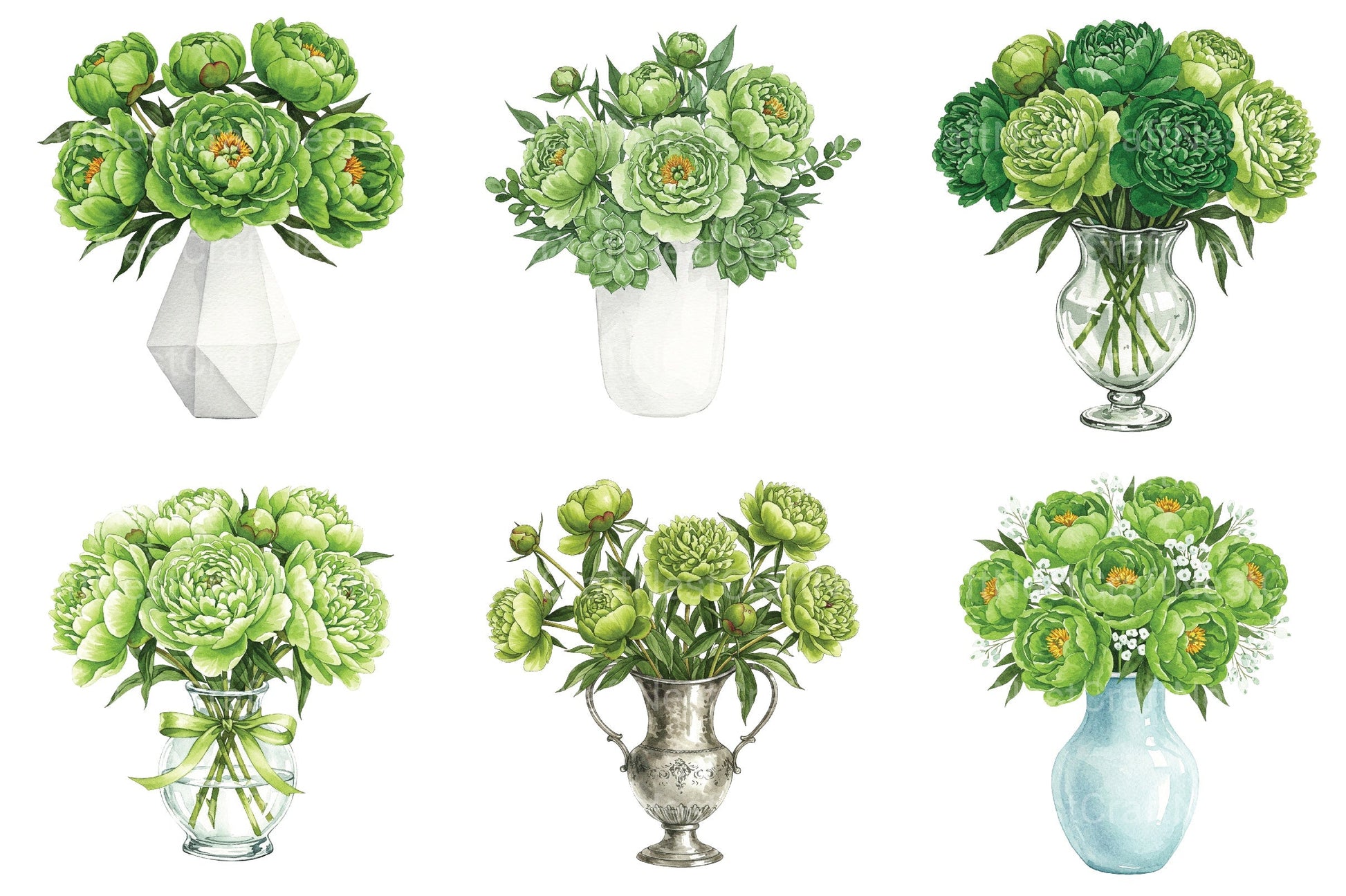 Arrange with this Green Peony Bouquet In Vase Clipart Bundle, featuring elegant peony designs, ideal for sophisticated floral crafts.