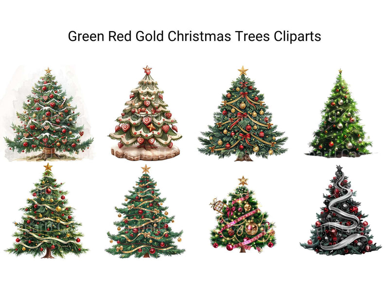 Deck the halls with this Green, Red, and Gold Christmas Trees Clipart set, featuring vibrant tree designs, perfect for holiday decor.