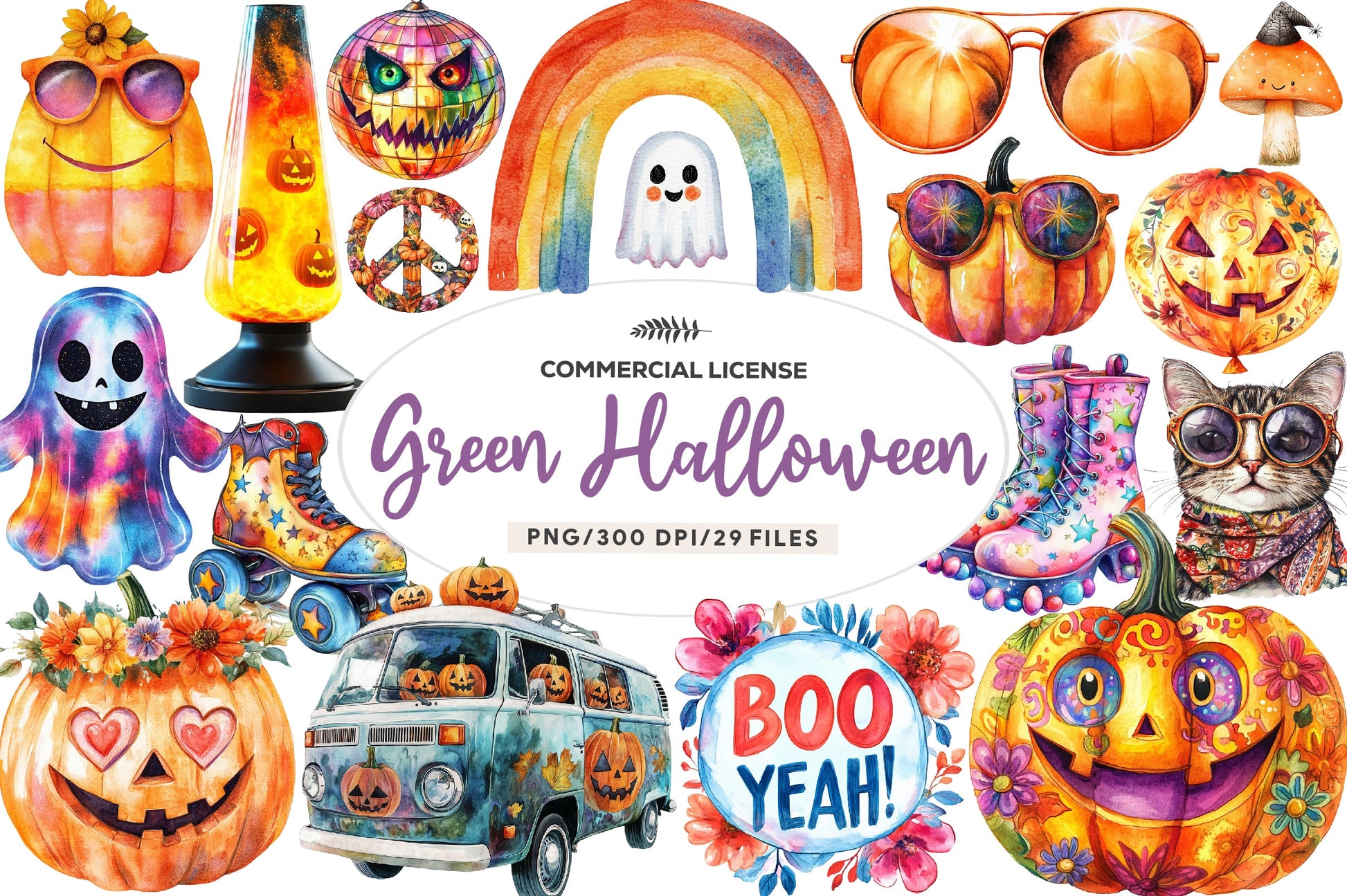Dance with this Groovy Halloween Day Clipart Bundle, featuring retro spooky designs, perfect for vintage Halloween crafts.