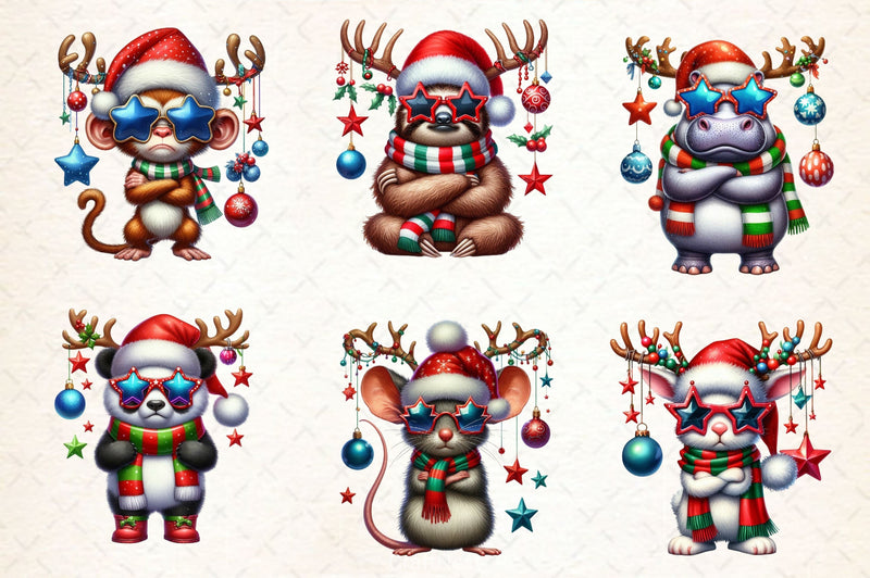 Amusing grumpy animals celebrating Christmas for humorous holiday projects.
