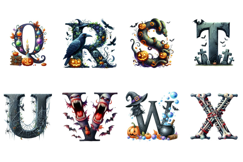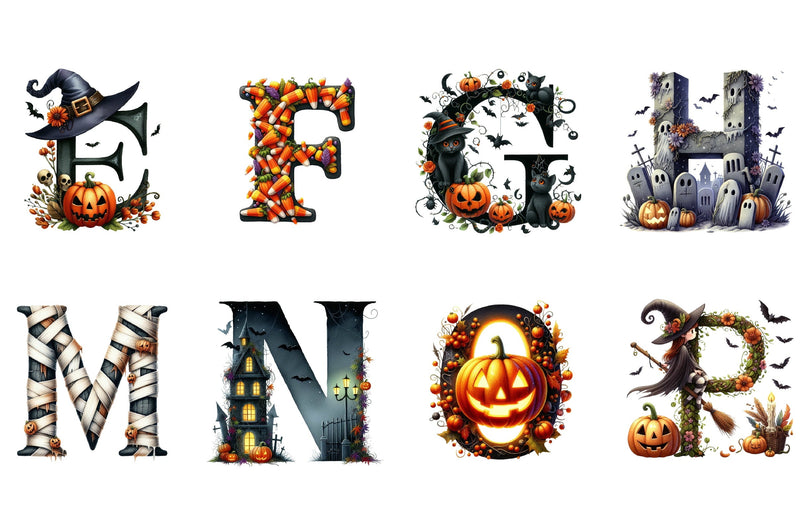 Get inspired with our Halloween Alphabet Clipart Bundle, featuring a variety of hauntingly beautiful designs for your seasonal creations.
