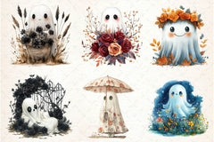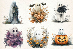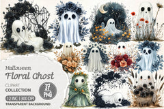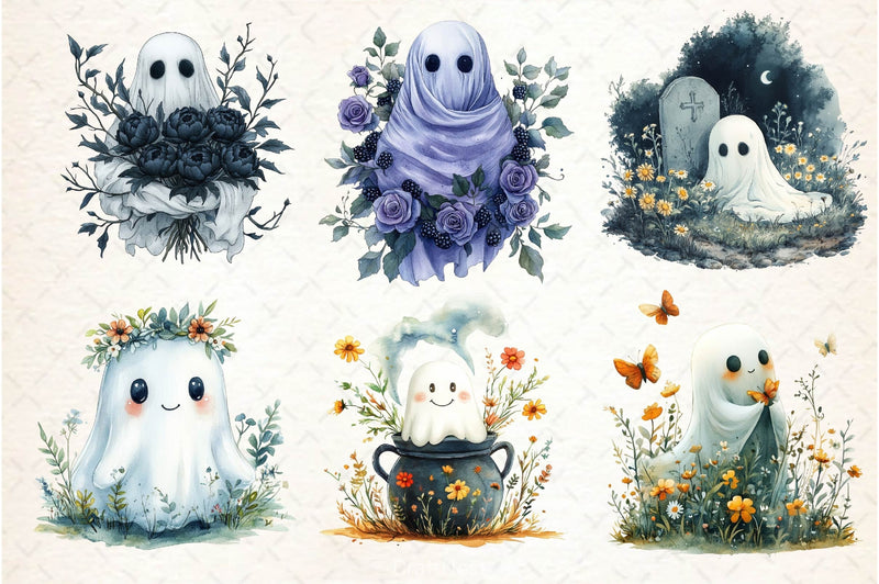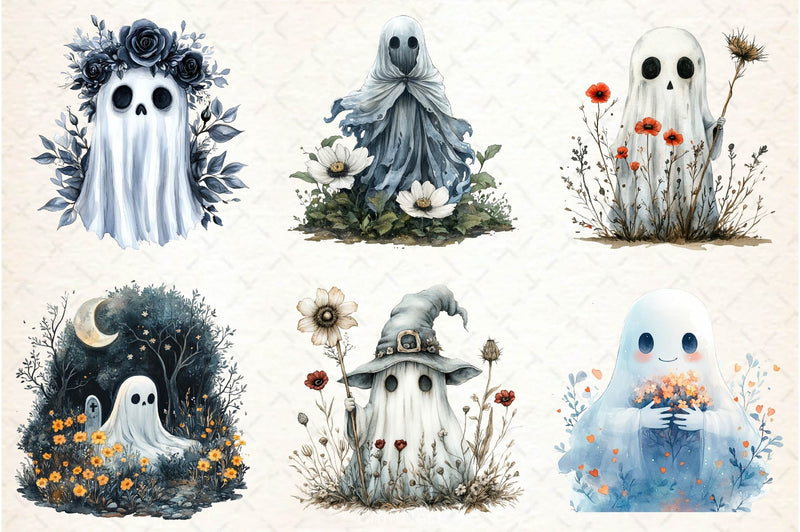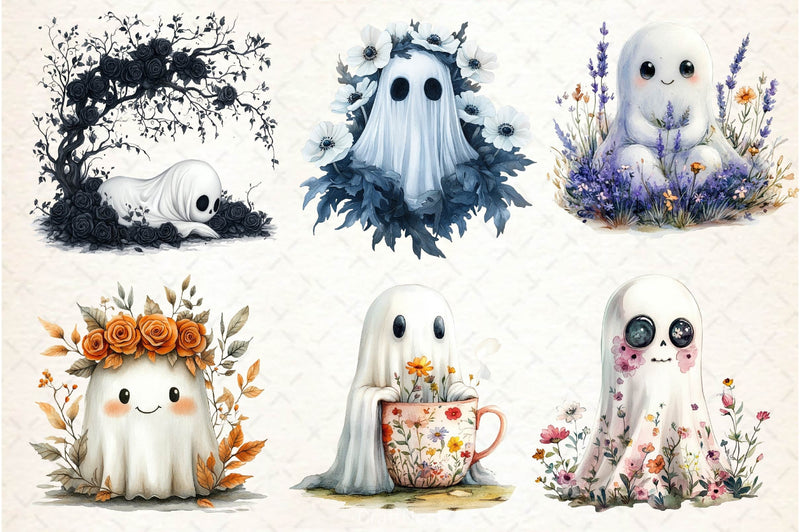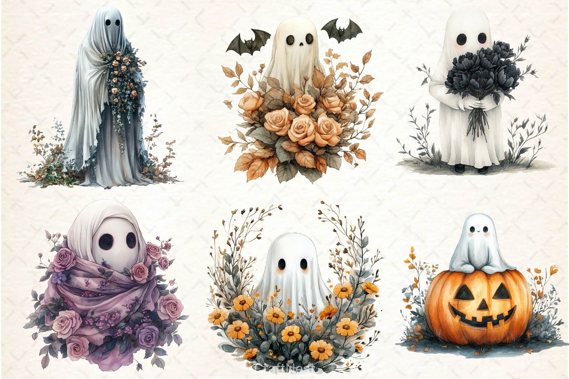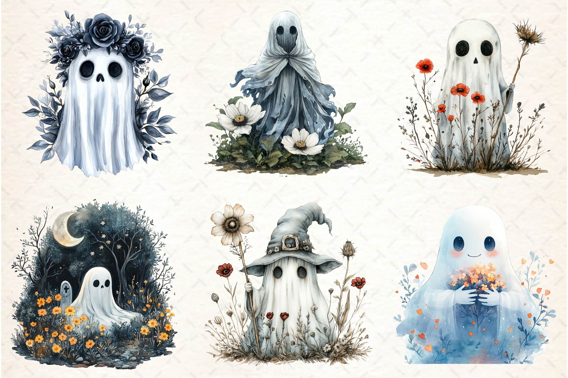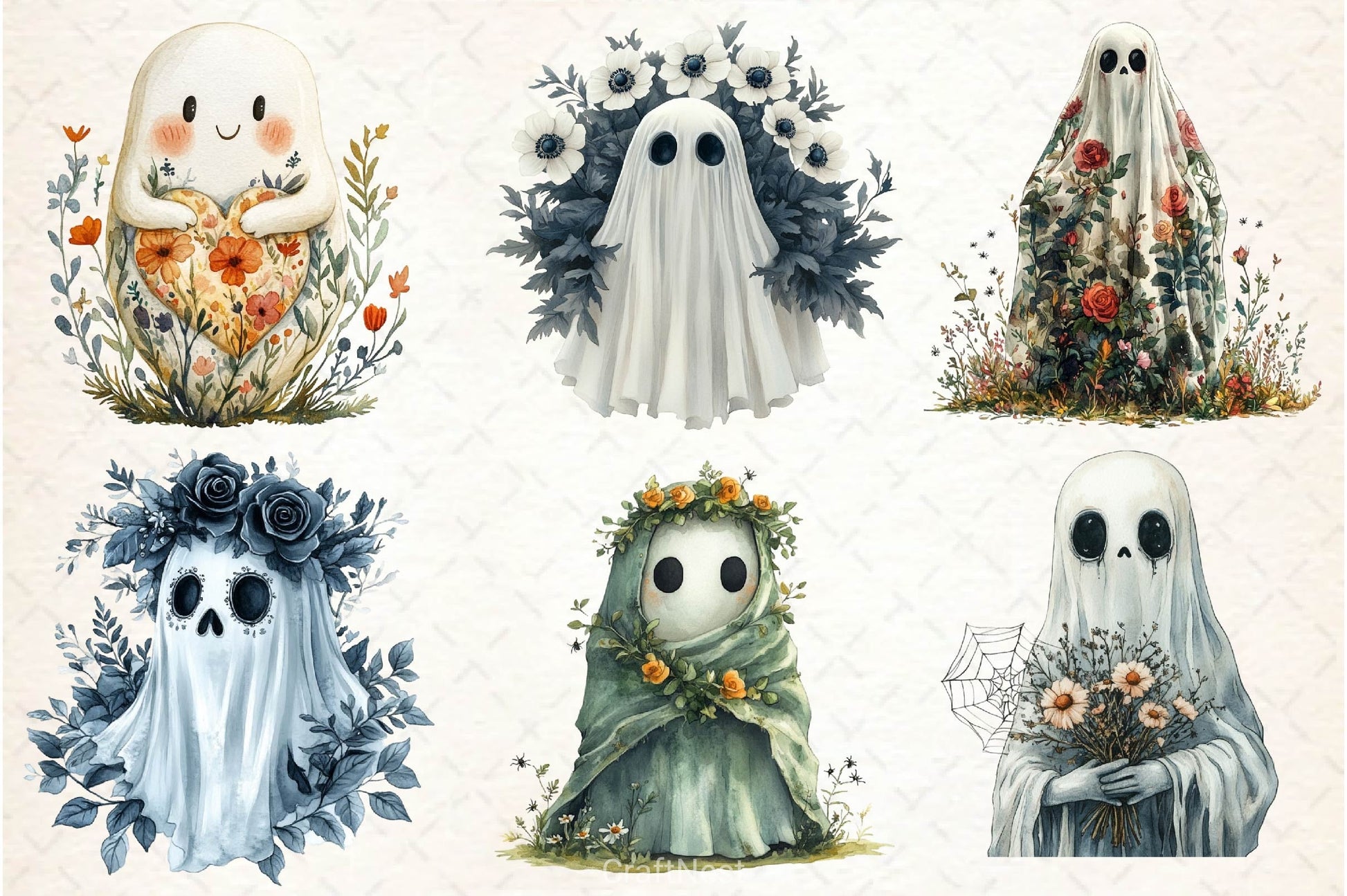 Spooky ghosts adorned with flowers for gothic garden projects.