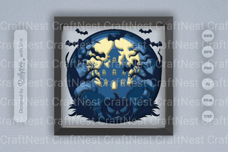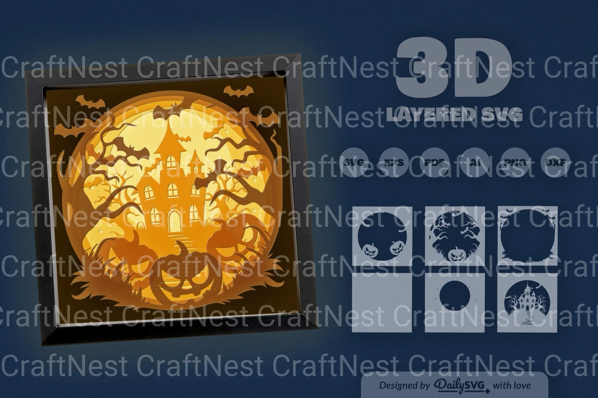Unleash the spookiness with our Halloween Haunted House Papercut SVG Bundle, featuring intricate haunted house designs and a charming pumpkin, perfect for crafting eerie decorations and festive projects.