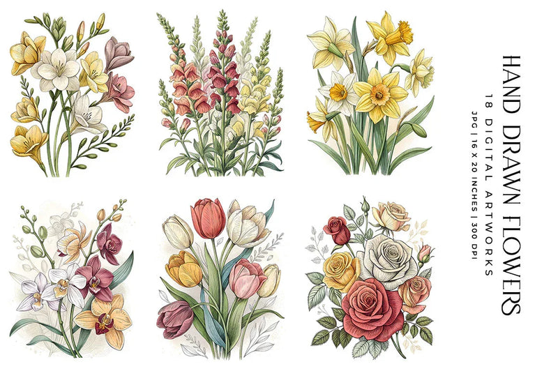 Enhance your creative projects with our Hand-drawn Flowers - Floral collection, featuring exquisite floral designs perfect for scrapbooking, card making, and home decor.