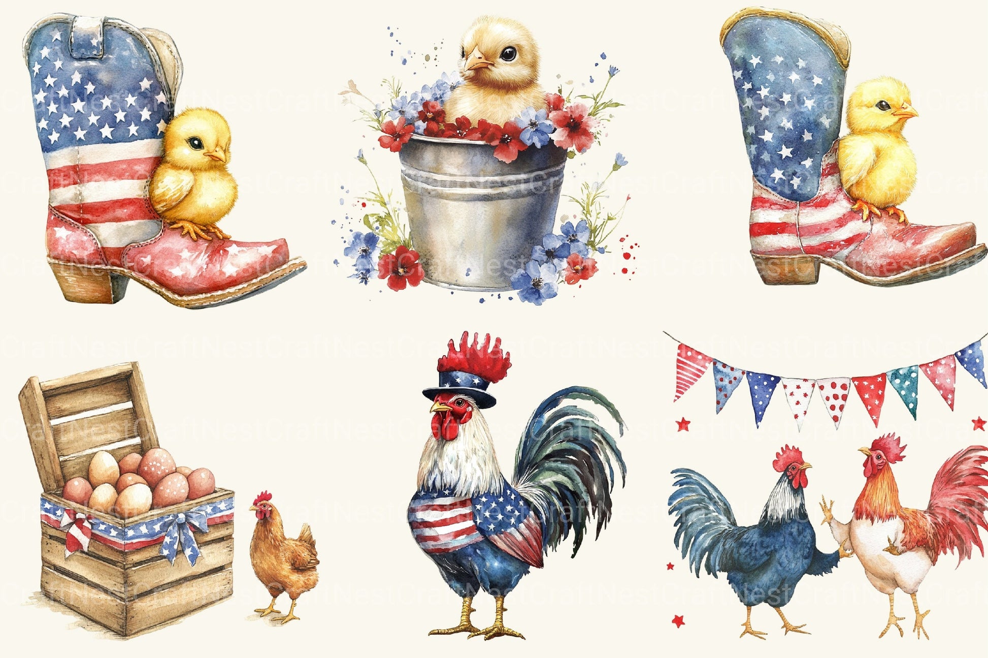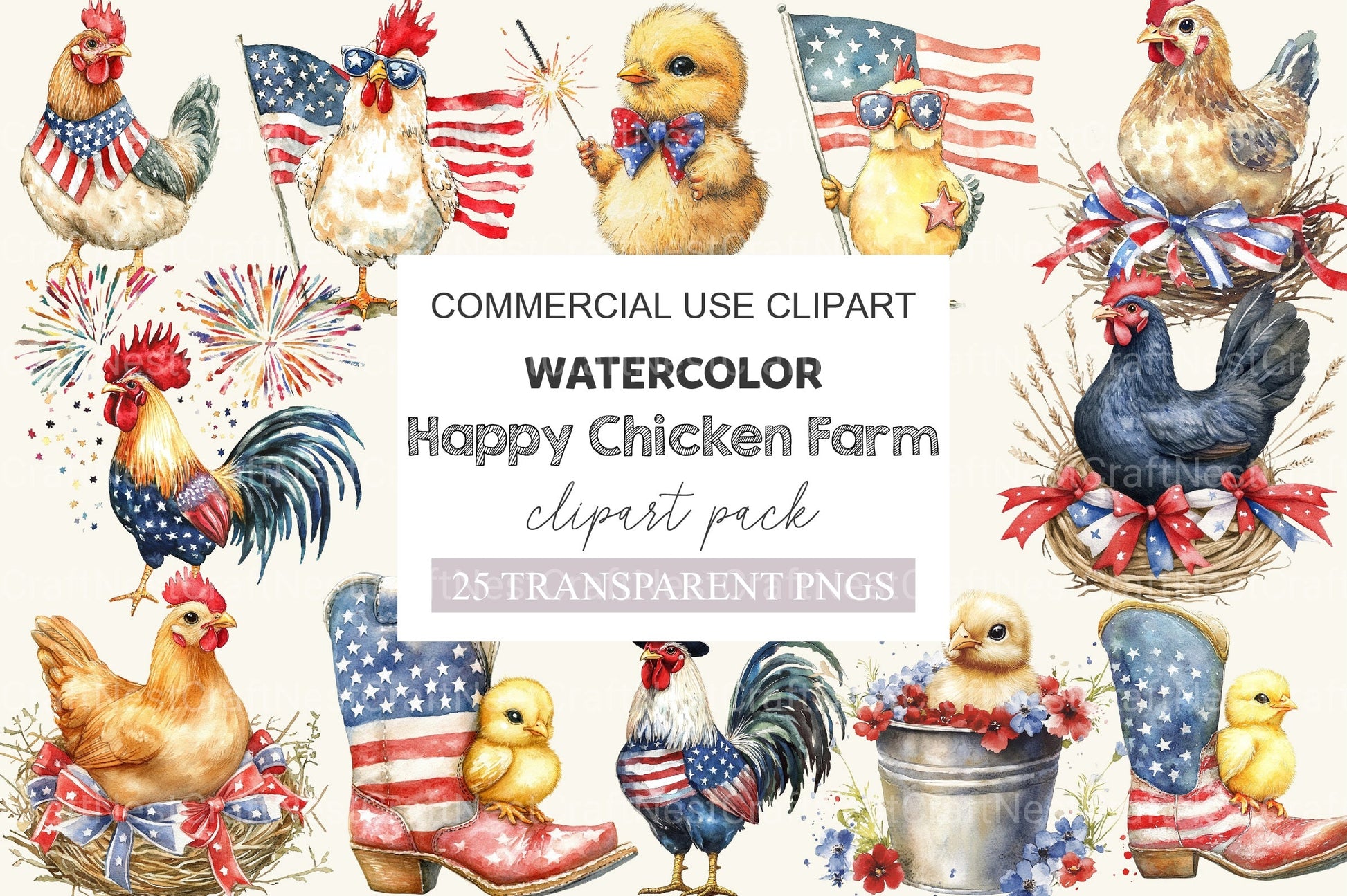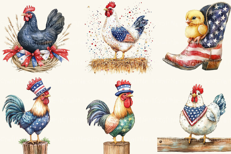 Cluck with this Happy Chicken Farm 4th Of July Clipart Bundle, featuring patriotic farm designs, perfect for agricultural Independence Day crafts.