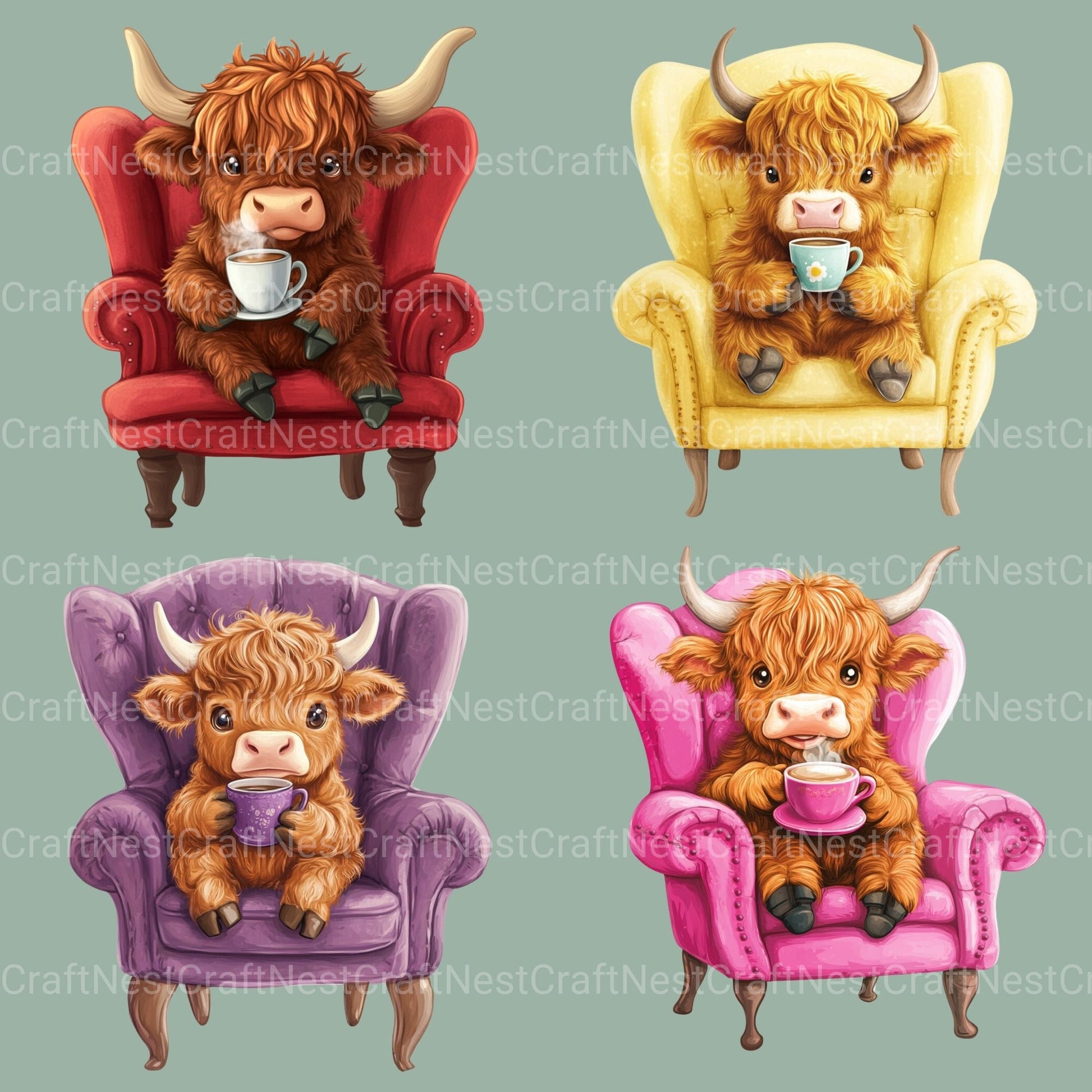 Sip with this Highland Cow Drinking Coffee 12 Clipart Bundle, featuring coffee-loving cow designs, perfect for animal drinks crafts.