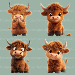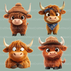 Graze with this Highland Cows 12 Clipart Bundle, featuring fluffy highland cow designs, ideal for farm animal crafts.