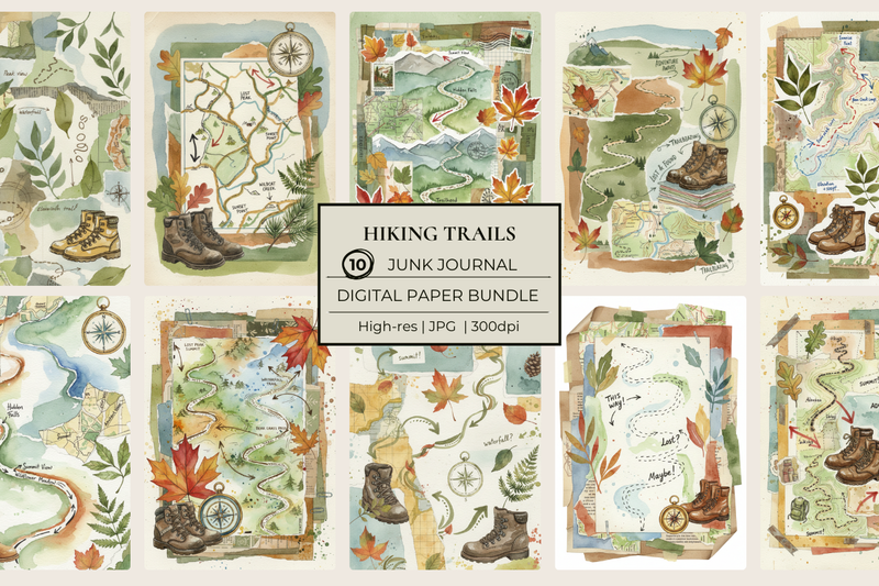 Embark on a creative journey with our Hiking Trails Junk Journal Papers, perfect for crafting unique travel diaries and nature-inspired scrapbooks. These beautifully designed pages capture the essence of the great outdoors, making them ideal for adventure-themed projects and personalized gifts.