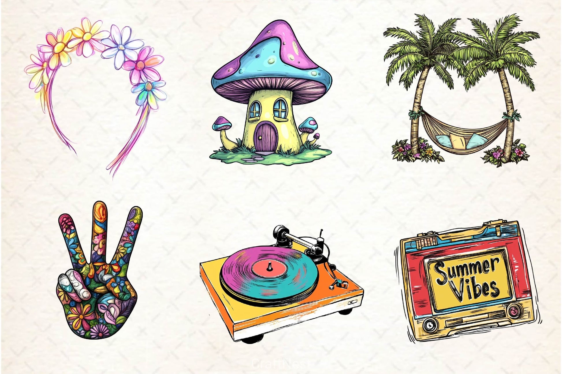 Peace with this Hippie Summer Clipart Bundle, featuring bohemian seasonal designs, perfect for free spirit summer crafts.